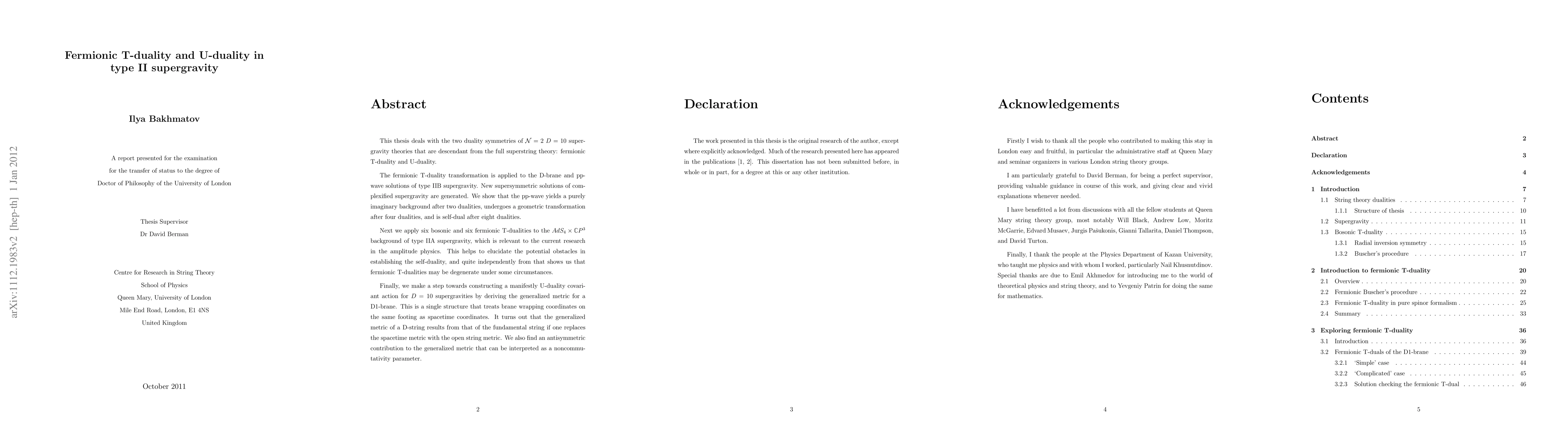 This paper explores fermionic T-duality and U-duality in type II supergravity, generating new supersymmetric solutions and demonstrating self-duality cycles for pp-wave solutions. It also investigates the implications of multiple T-dualities on the AdS_4 x CP^3 background and derives a generalized metric for D1-branes to construct a U-duality covariant action.