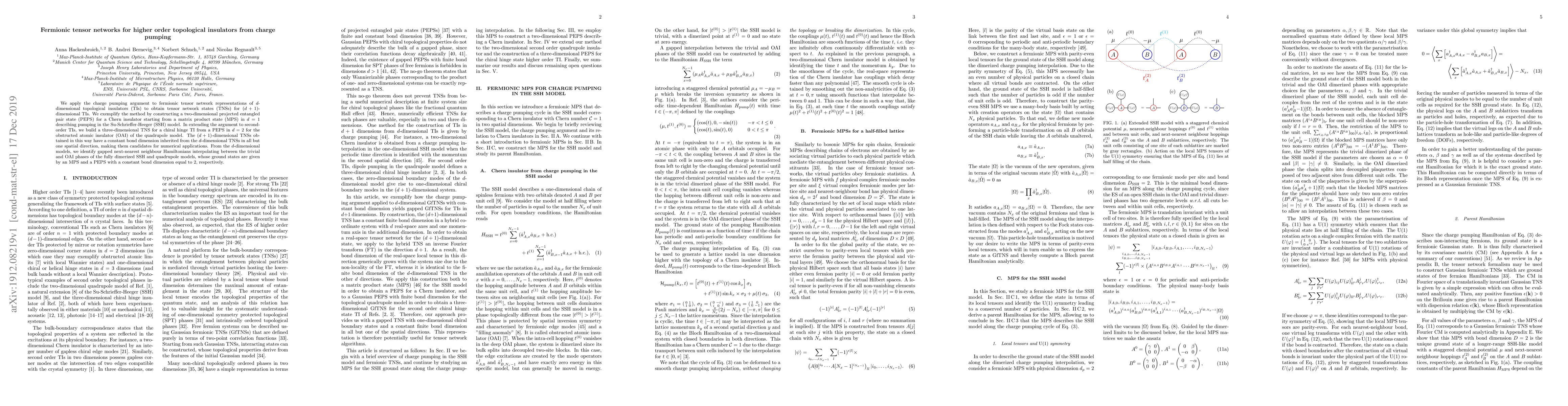 This research applies charge pumping arguments to fermionic tensor networks, constructing (d+1)-dimensional topological insulator (TI) tensor network states from d-dimensional ones. It exemplifies this method using a 2D PEPS for a Chern insulator from a 1D MPS for SSH model pumping, and a 3D TNS for a chiral hinge TI from a 2D PEPS for a quadrupole model's obstructed atomic insulator (OAI) phase. The (d+1)-dimensional TNSs maintain a constant bond dimension, making them suitable for numerical applications, and identifies gapped next-nearest neighbor Hamiltonians interpolating between trivial and OAI phases.