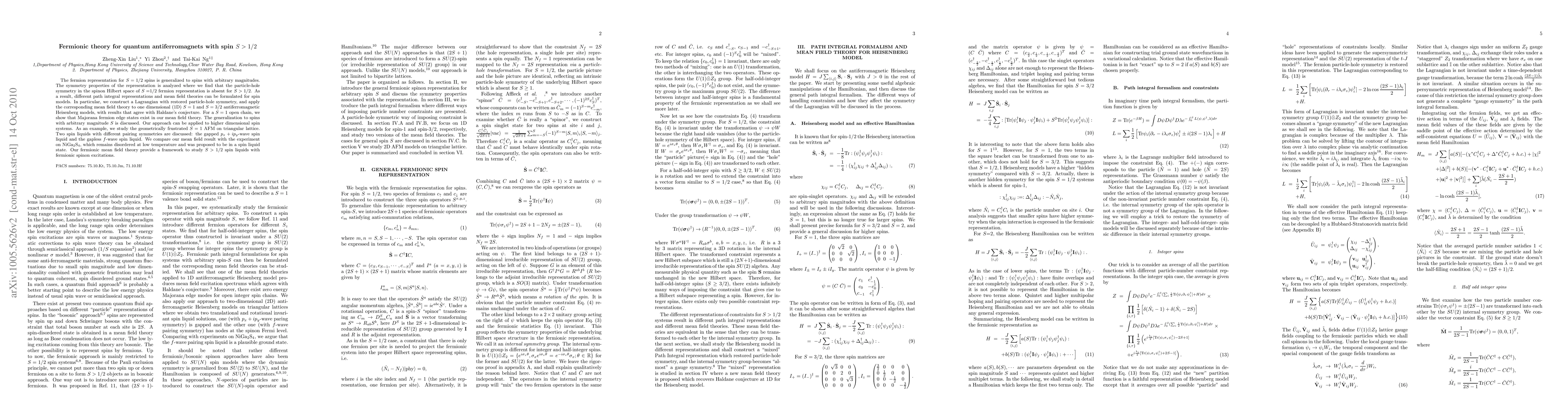 This paper generalizes the fermion representation for quantum antiferromagnets to spins with magnitudes greater than 1/2, revealing the absence of particle-hole symmetry for S > 1/2. It proposes a Lagrangian with restored symmetry and applies a mean field theory to 1D and 2D spin models, confirming Haldane's conjecture and predicting Majorana fermion edge states and different spin liquid phases in higher dimensions.