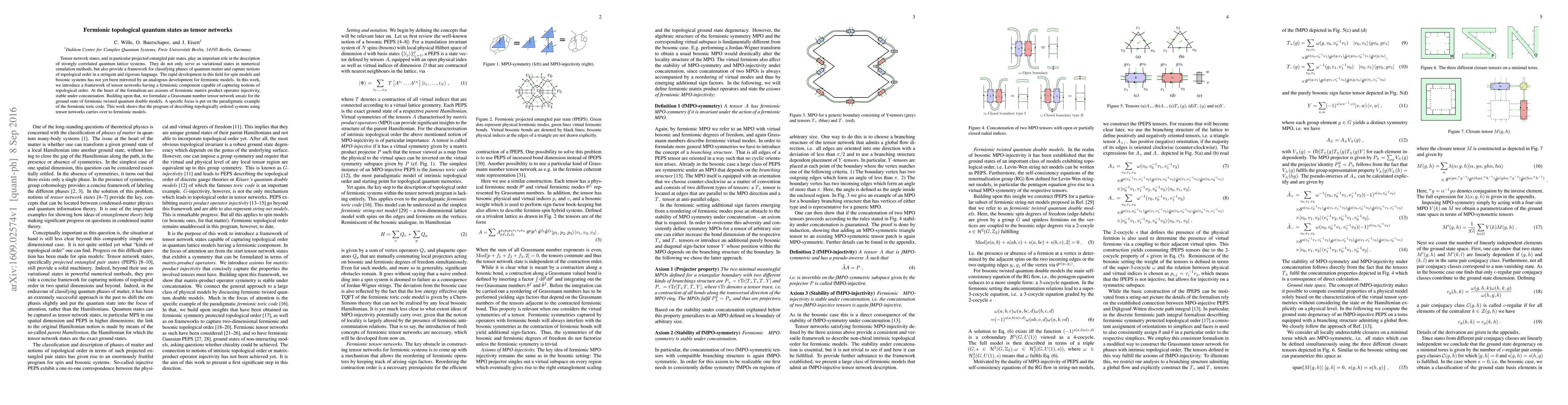 Tensor network states, and in particular projected entangled pair states, play an important role in the description of strongly correlated quantum lattice systems. They do not only serve as variational states in numerical simulation methods, but also provide a framework for classifying phases of quantum matter and capture notions of topological order in a stringent and rigorous language. The rapid development in this field for spin models and bosonic systems has not yet been mirrored by an analogous development for fermionic models. In this work, we introduce a framework of tensor networks having a fermionic component capable of capturing notions of topological order. At the heart of the formalism are axioms of fermionic matrix product operator injectivity, stable under concatenation. Building upon that, we formulate a Grassmann number tensor network ansatz for the ground state of fermionic twisted quantum double models. A specific focus is put on the paradigmatic example of the fermionic toric code. This work shows that the program of describing topologically ordered systems using tensor networks carries over to fermionic models.