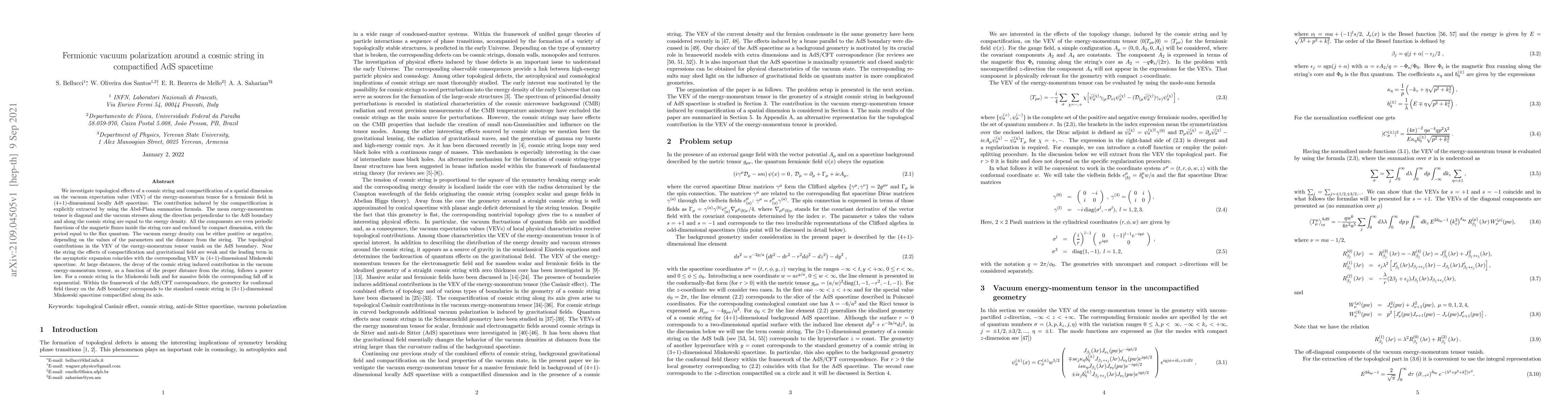 This paper examines how a cosmic string and spatial dimension compactification in (4+1)-dimensional locally AdS spacetime affect the vacuum expectation value of the energy-momentum tensor for a fermionic field. The study reveals periodic dependencies on magnetic fluxes and indicates that topological contributions vanish on the AdS boundary, with power law decay at large distances.