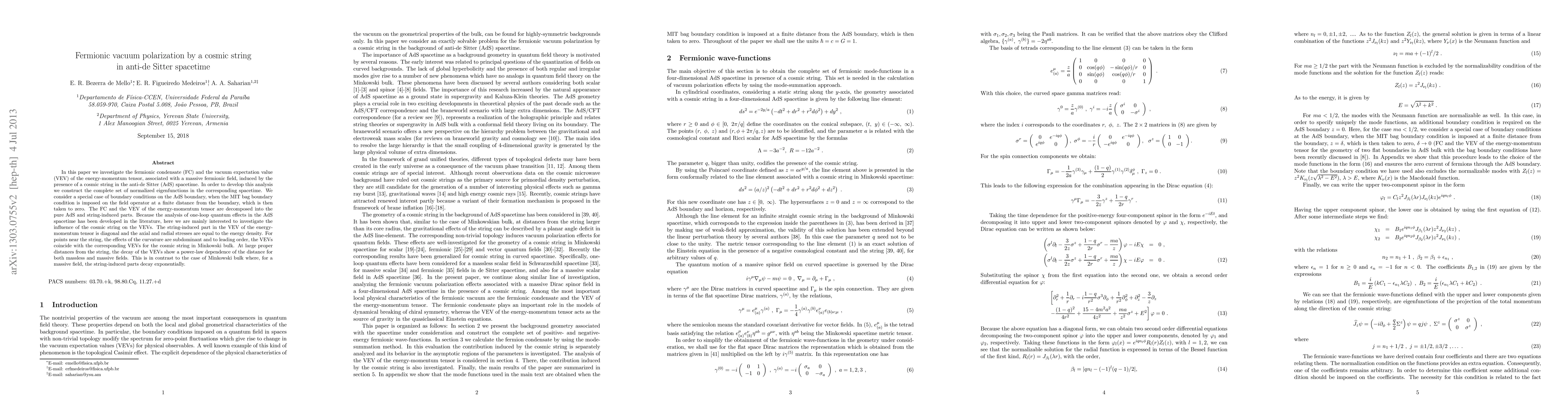 This paper studies the fermionic condensate and vacuum expectation value of the energy-momentum tensor induced by a cosmic string in anti-de Sitter spacetime, focusing on the string's influence on these values. The analysis reveals that at large distances, the effects decay as a power law, contrasting the Minkowski bulk's exponential decay for massive fields.
