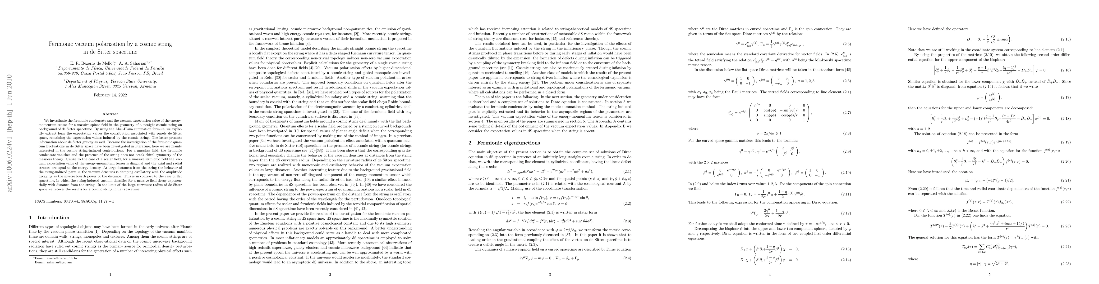 This paper investigates fermionic vacuum polarization around a cosmic string in de Sitter spacetime, finding that the vacuum expectation value of the energy-momentum tensor for massive fermions is affected, while massless fermions show no condensate. Unlike in flat spacetime, the string-induced vacuum densities decay as the inverse fourth power at large distances.