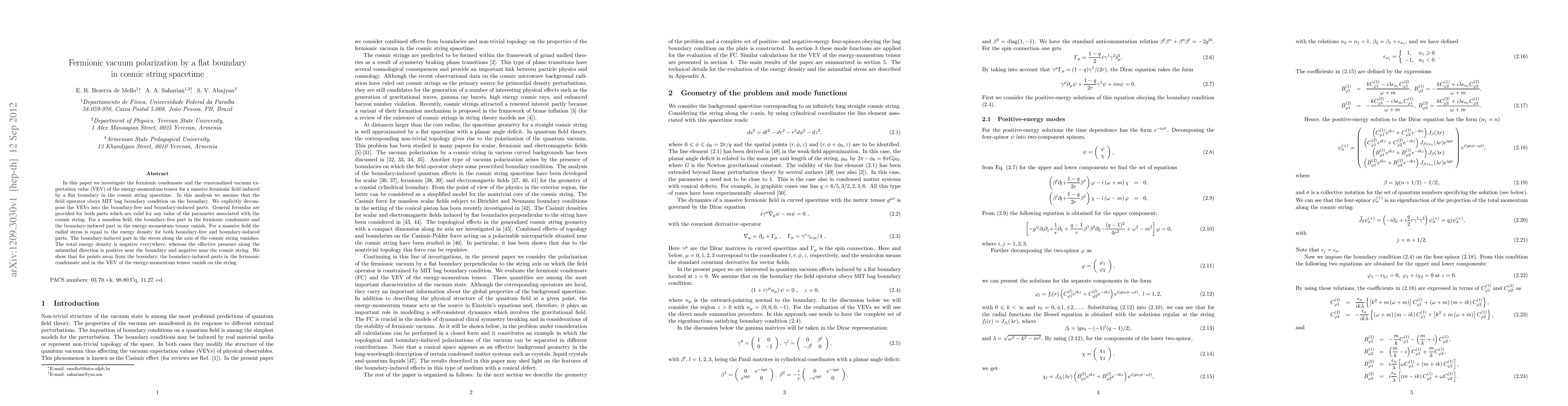 This paper examines the impact of a flat boundary on fermionic vacuum polarization in cosmic string spacetime, revealing that while the boundary-induced parts vanish for massless fermions, they persist for massive fermions, influencing both the energy-momentum tensor and fermionic condensate, with significant variations in energy density and pressure near the boundary and cosmic string.