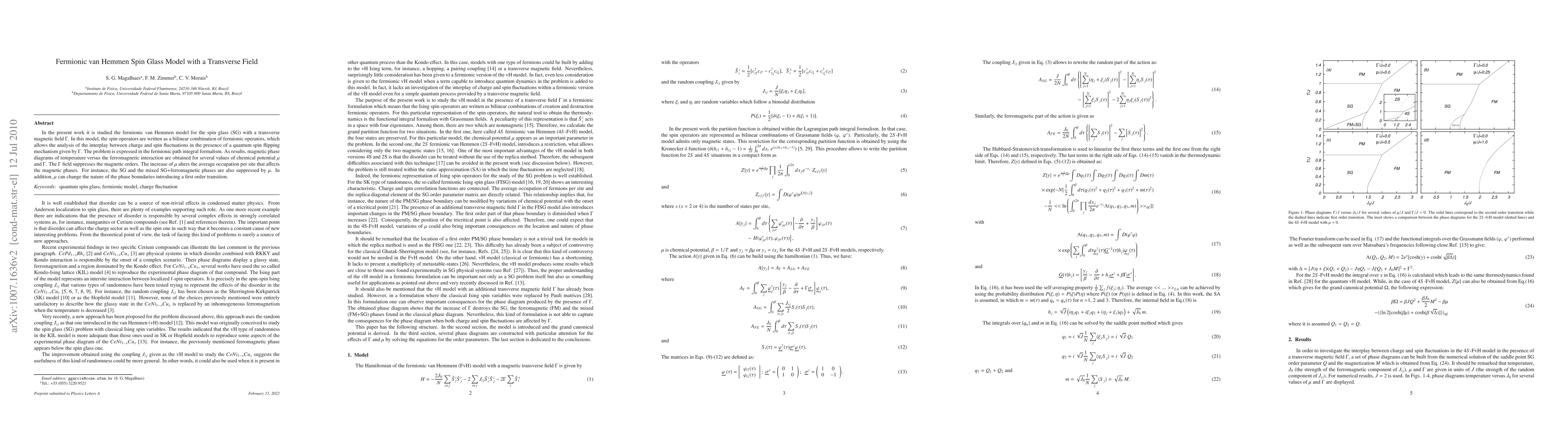 This paper investigates the fermionic van Hemmen spin glass model under a transverse magnetic field, revealing how charge and spin fluctuations interact. The study finds that the transverse field suppresses magnetic orders, and varying the chemical potential alters the magnetic phases, potentially inducing first-order transitions.