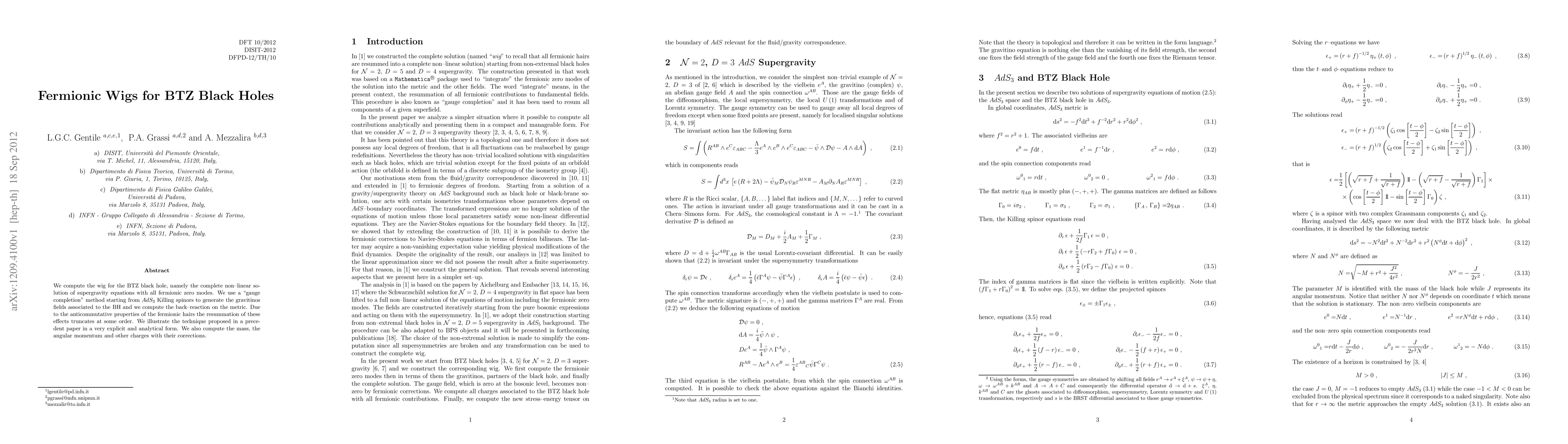 We compute the wig for the BTZ black hole, namely the complete non-linear solution of supergravity equations with all fermionic zero modes. We use a "gauge completion" method starting from AdS_3 Killing spinors to generate the gravitinos fields associated to the BH and we compute the back-reaction on the metric. Due to the anticommutative properties of the fermionic hairs the resummation of these effects truncates at some order. We illustrate the technique proposed in a precedent paper in a very explicit and analytical form. We also compute the mass, the angular momentum and other charges with their corrections.