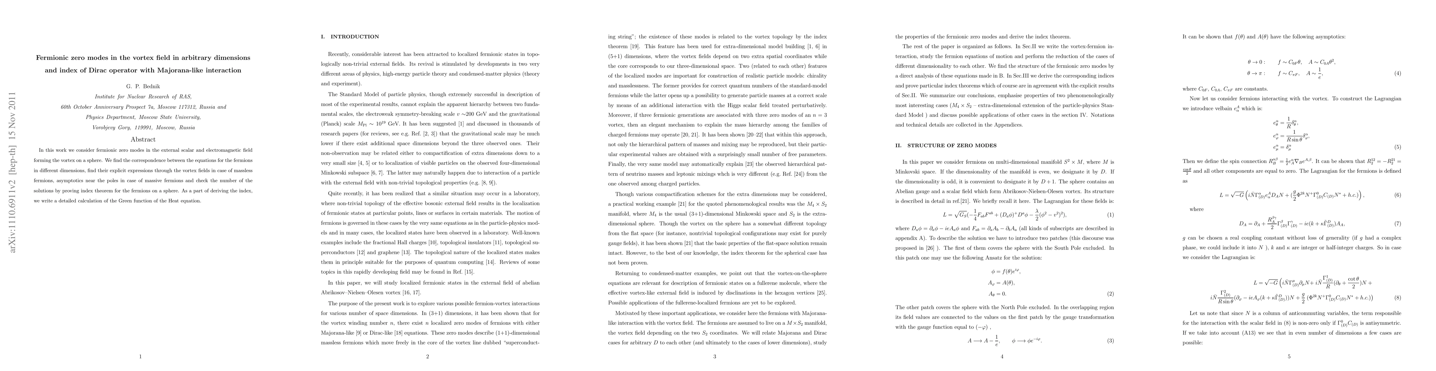 This research identifies fermionic zero modes in vortex fields across dimensions, deriving explicit expressions for massless fermions and asymptotic behaviors for massive fermions near poles on a sphere. It validates solution counts via an index theorem for fermions on a sphere, with a detailed Green function calculation for the Heat equation as part of the index derivation.