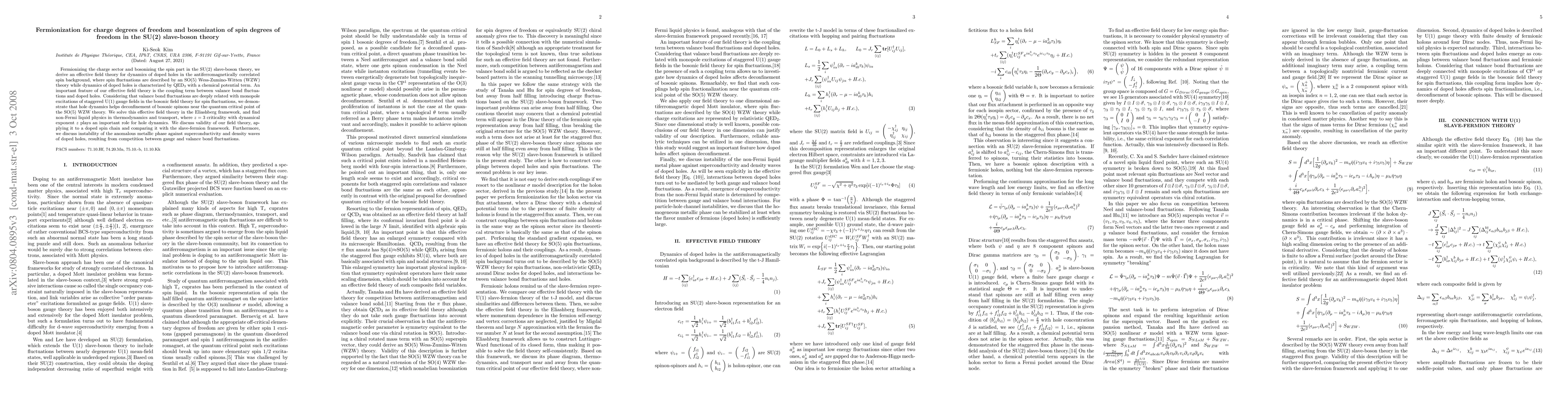 Fermionizing the charge sector and bosonizing the spin part in the SU(2) slave-boson theory, we derive an effective field theory for dynamics of doped holes in the antiferromagnetically correlated spin background, where spin fluctuations are described by an SO(5) Wess-Zumino-Witten (WZW) theory while dynamics of doped holes is characterized by QED$_{3}$ with a chemical potential term. An important feature of our effective field theory is the coupling term between valance bond fluctuations and doped holes. Considering that valance bond fluctuations are deeply related with monopole excitations of staggered U(1) gauge fields in the bosonic field theory for spin fluctuations, we demonstrate that hole dynamics helps deconfinement of bosonic spinons near the quantum critical point of the SO(5) WZW theory. We solve this effective field theory in the Eliashberg framework, and find non-Fermi liquid physics in thermodynamics and transport, where $z = 3$ criticality with dynamical exponent $z$ plays an important role for hole dynamics. We discuss validity of our field theory, applying it to a doped spin chain and comparing it with the slave-fermion framework. Furthermore, we discuss instability of the anomalous metallic phase against superconductivity and density waves of doped holes, resulting from competition between gauge and valance bond fluctuations.