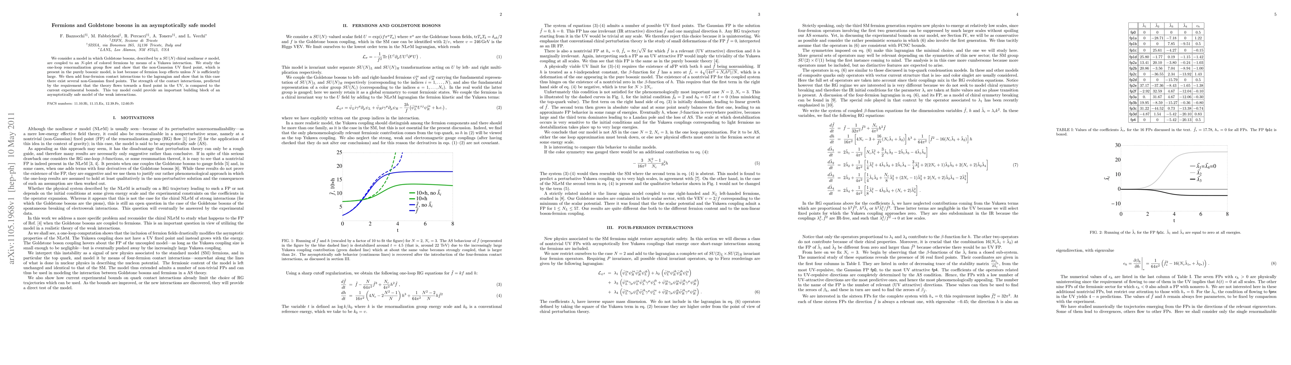 We consider a model in which Goldstone bosons, described by a SU(N) chiral nonlinear sigma model, are coupled to an N-plet of colored fermions by means of a Yukawa interaction. We study the one-loop renormalization group flow and show that the non-Gaussian UV fixed point, which is present in the purely bosonic model, is lost because of fermion loop effects unless N is sufficiently large. We then add four-fermion contact interactions to the lagrangian and show that in this case there exist several non-Gaussian fixed points. The strength of the contact interactions, predicted by the requirement that the theory flows towards a fixed point in the UV, is compared to the current experimental bounds. This toy model could provide an important building block of an asymptotically safe model of the weak interactions.