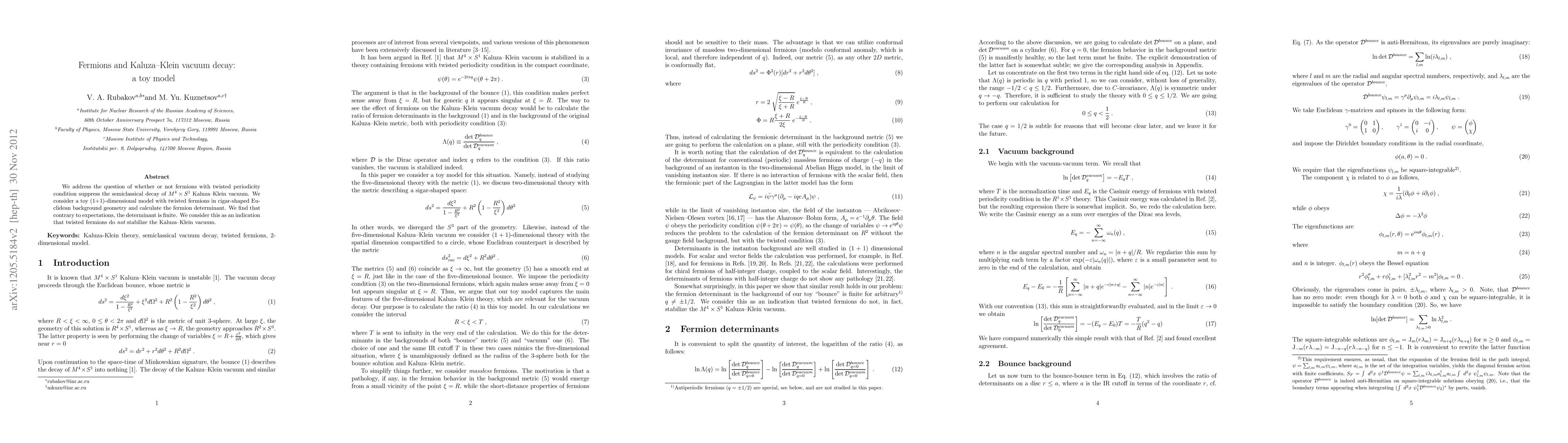 We address the question of whether or not fermions with twisted periodicity condition suppress the semiclassical decay of M^4xS^1 Kaluza--Klein vacuum. We consider a toy (1+1)-dimensional model with twisted fermions in cigar-shaped Euclidean background geometry and calculate the fermion determinant. We find that contrary to expectations, the determinant is finite. We consider this as an indication that twisted fermions do not stabilize the Kaluza--Klein vacuum.