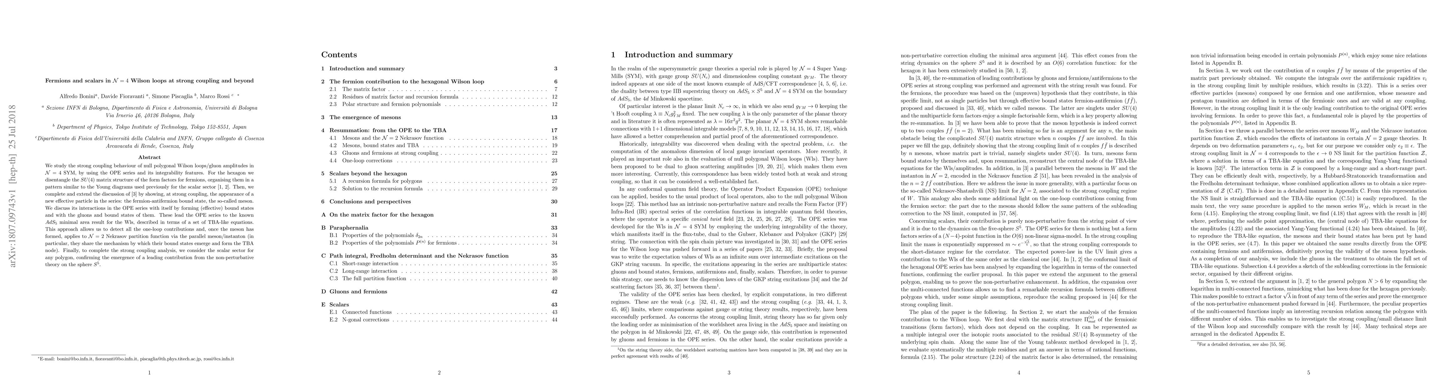 We study the strong coupling behaviour of null polygonal Wilson loops/gluon amplitudes in $\mathcal{N} = 4$ SYM, by using the OPE series and its integrability features. For the hexagon we disentangle the $SU(4)$ matrix structure of the form factors for fermions, organising them in a pattern similar to the Young diagrams used previously for the scalar sector \cite{BFPR2,BFPR3}. Then, we complete and extend the discussion of \cite{BFPR1} by showing, at strong coupling, the appearance of a new effective particle in the series: the fermion-antifermion bound state, the so-called meson. We discuss its interactions in the OPE series with itself by forming (effective) bound states and with the gluons and bound states of them. These lead the OPE series to the known $AdS_5$ minimal area result for the Wls, described in terms of a set of TBA-like equations. This approach allows us to detect all the one-loop contributions and, once the meson has formed, applies to $\mathcal{N}=2$ Nekrasov partition function via the parallel meson/instanton (in particular, they share the mechanism by which their bound states emerge and form the TBA node). Finally, to complete the strong coupling analysis, we consider the scalar sector for any polygon, confirming the emergence of a leading contribution from the non-perturbative theory on the sphere $S^5$.