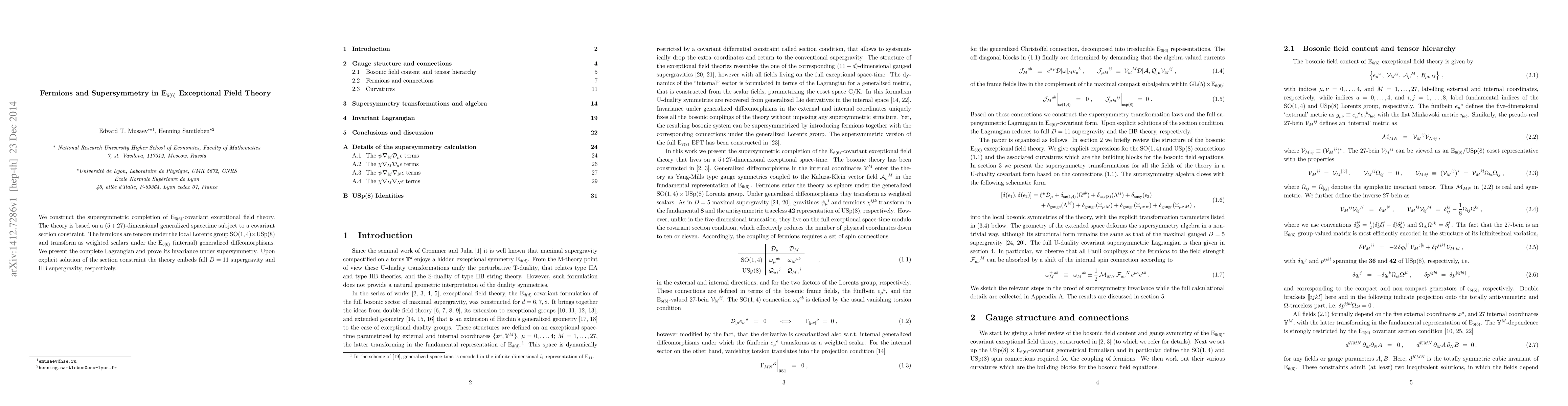 We construct the supersymmetric completion of E$_{6(6)}$-covariant exceptional field theory. The theory is based on a $(5+27)$-dimensional generalized space-time subject to a covariant section constraint. The fermions are tensors under the local Lorentz group ${\rm SO}(1,4)\times {\rm USp}(8)$ and transform as weighted scalars under the E$_{6(6)}$ (internal) generalized diffeomorphisms. We present the complete Lagrangian and prove its invariance under supersymmetry. Upon explicit solution of the section constraint the theory embeds full $D=11$ supergravity and IIB supergravity, respectively.