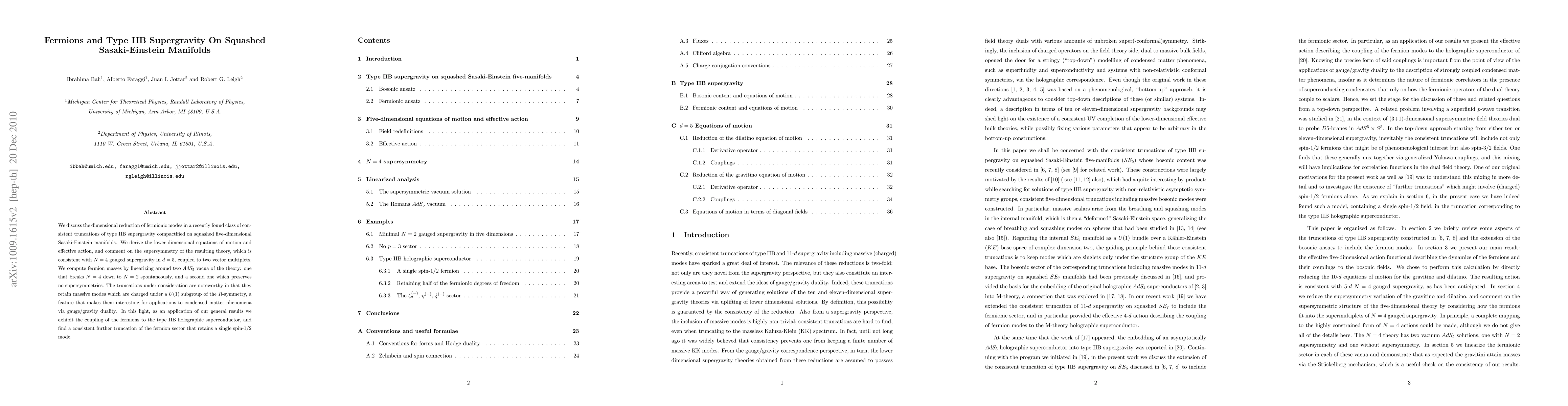 We discuss the dimensional reduction of fermionic modes in a recently found class of consistent truncations of type IIB supergravity compactified on squashed five-dimensional Sasaki-Einstein manifolds. We derive the lower dimensional equations of motion and effective action, and comment on the supersymmetry of the resulting theory, which is consistent with N=4 gauged supergravity in $d=5$, coupled to two vector multiplets. We compute fermion masses by linearizing around two $AdS_{5}$ vacua of the theory: one that breaks N=4 down to N=2 spontaneously, and a second one which preserves no supersymmetries. The truncations under consideration are noteworthy in that they retain massive modes which are charged under a U(1) subgroup of the $R$-symmetry, a feature that makes them interesting for applications to condensed matter phenomena via gauge/gravity duality. In this light, as an application of our general results we exhibit the coupling of the fermions to the type IIB holographic superconductor, and find a consistent further truncation of the fermion sector that retains a single spin-1/2 mode.