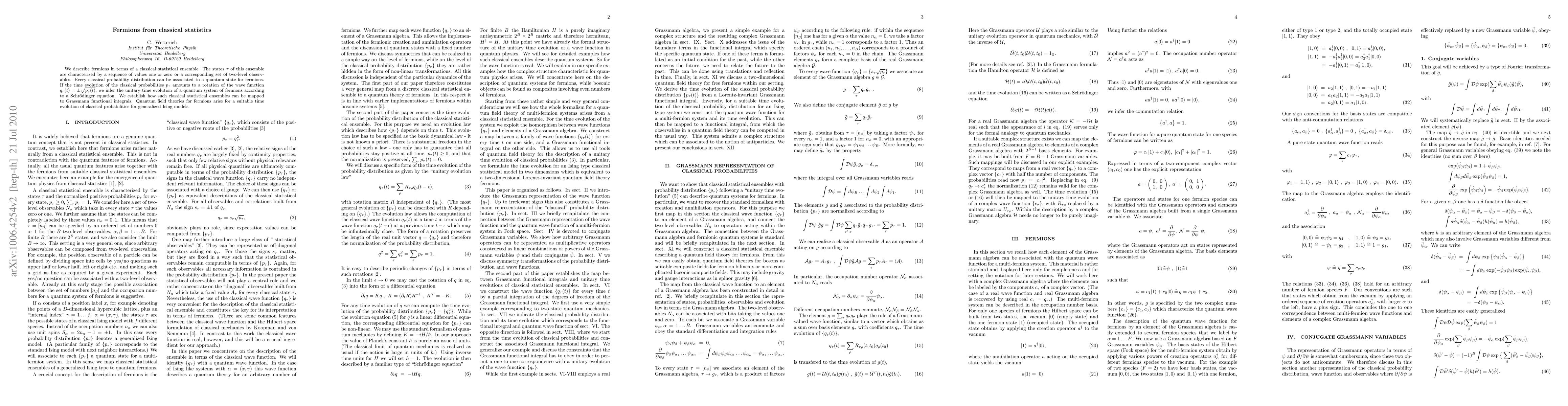 This paper explores fermions through classical statistical ensembles, showing how classical probability distributions correspond to quantum states. It demonstrates that a suitable time evolution of classical probabilities can lead to the unitary time evolution of quantum fermion systems, and connects classical statistical ensembles to Grassmann functional integrals, thus linking them to quantum field theories.