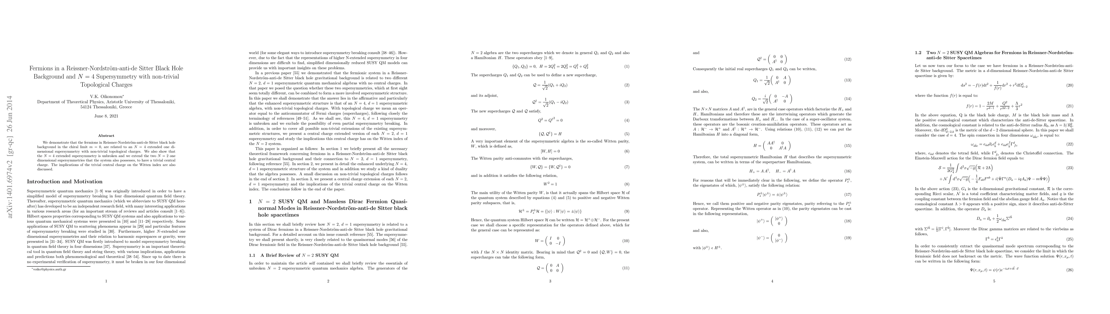 This paper investigates fermions in a Reissner-Nordström-AdS black hole, revealing their connection to $N=4$ extended one-dimensional supersymmetry with non-trivial topological charges. It demonstrates the unbroken nature of this $N=4$ supersymmetry and discusses the implications of a trivial central charge on the Witten index.