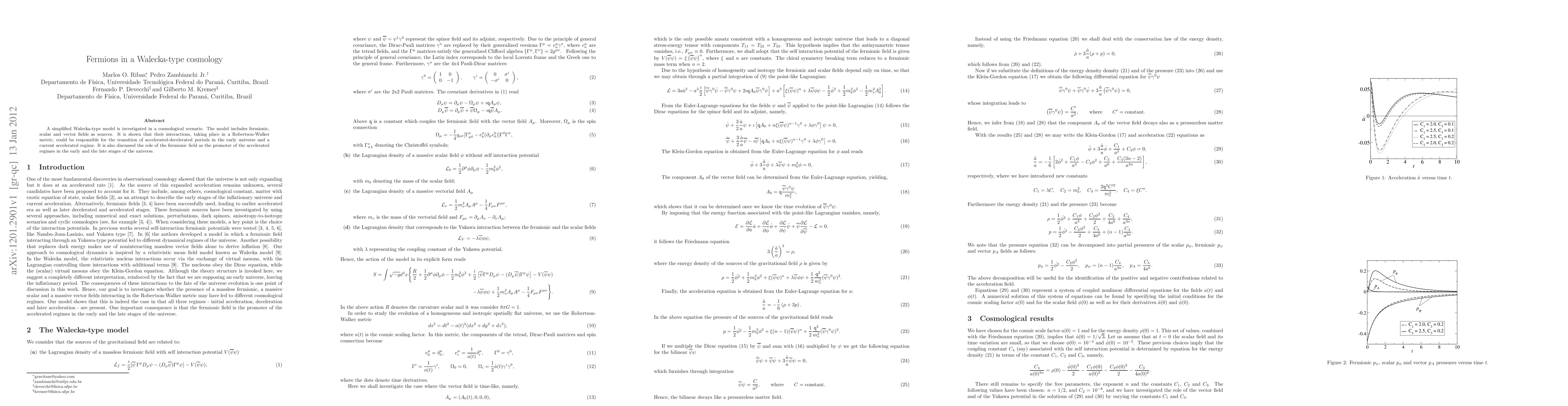 A simplified Walecka-type model is investigated in a cosmological scenario. The model includes fermionic, scalar and vector fields as sources. It is shown that their interactions, taking place in a Robertson-Walker metric, could be responsible for the transition of accelerated-decelerated periods in the early universe and a current accelerated regime. It is also discussed the role of the fermionic field as the promoter of the accelerated regimes in the early and the late stages of the universe.