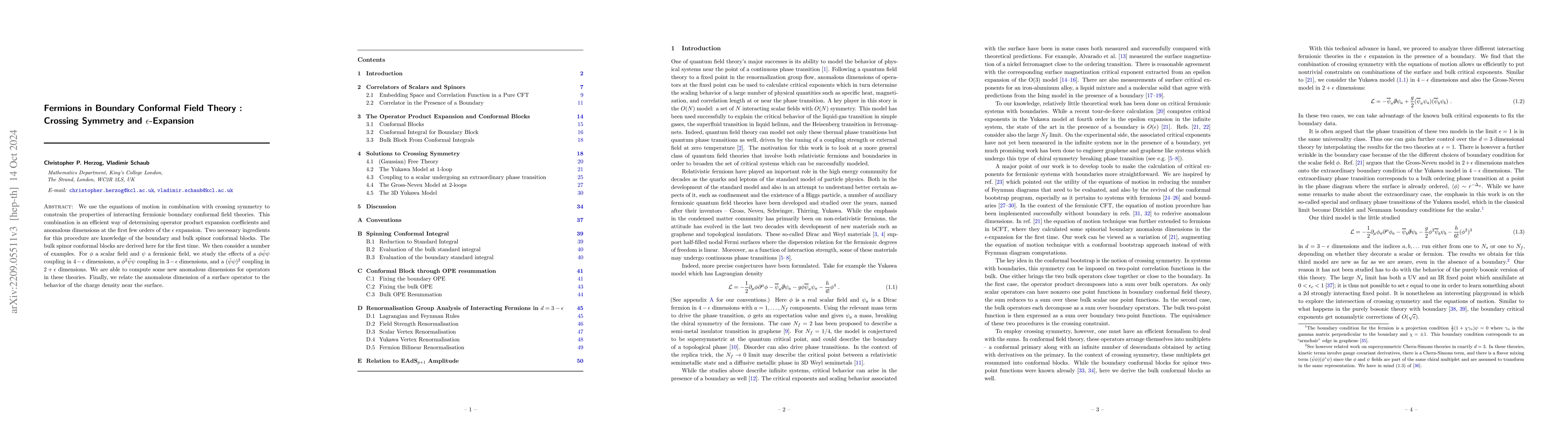 This paper explores interacting fermionic boundary conformal field theories using crossing symmetry and the $\epsilon$-expansion. It derives bulk spinor conformal blocks for the first time and computes new anomalous dimensions for various couplings in lower-dimensional approximations, relating surface operator anomalous dimensions to charge density behavior.
