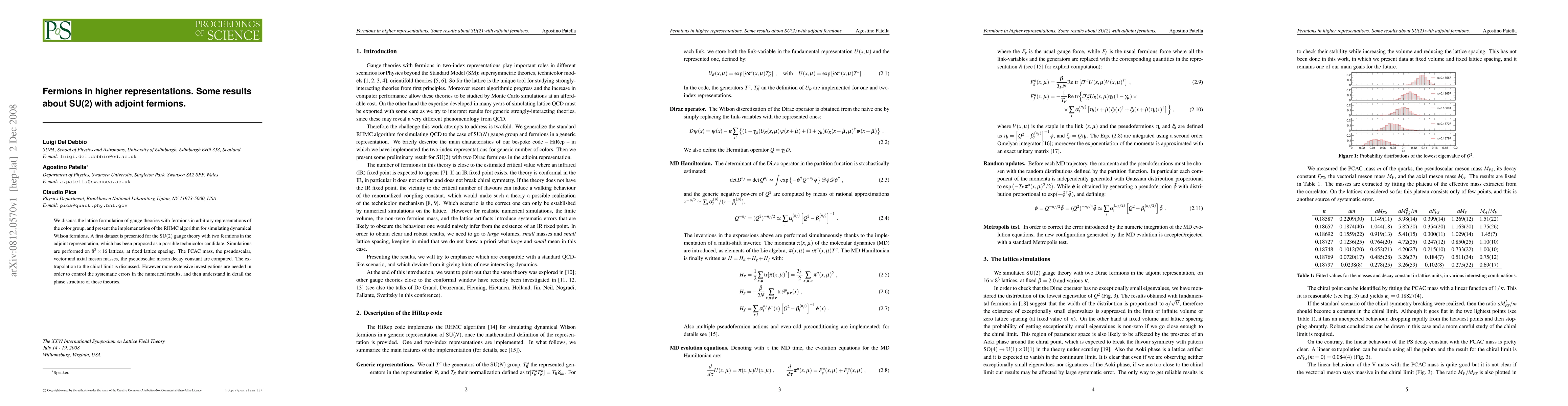 We discuss the lattice formulation of gauge theories with fermions in arbitrary representations of the color group, and present the implementation of the RHMC algorithm for simulating dynamical Wilson fermions. A first dataset is presented for the SU(2) gauge theory with two fermions in the adjoint representation, which has been proposed as a possible technicolor candidate. Simulations are performed on 8^3x16 lattices, at fixed lattice spacing. The PCAC mass, the pseudoscalar, vector and axial meson masses, the pseudoscalar meson decay constant are computed. The extrapolation to the chiral limit is discussed. However more extensive investigations are needed in order to control the systematic errors in the numerical results, and then understand in detail the phase structure of these theories.