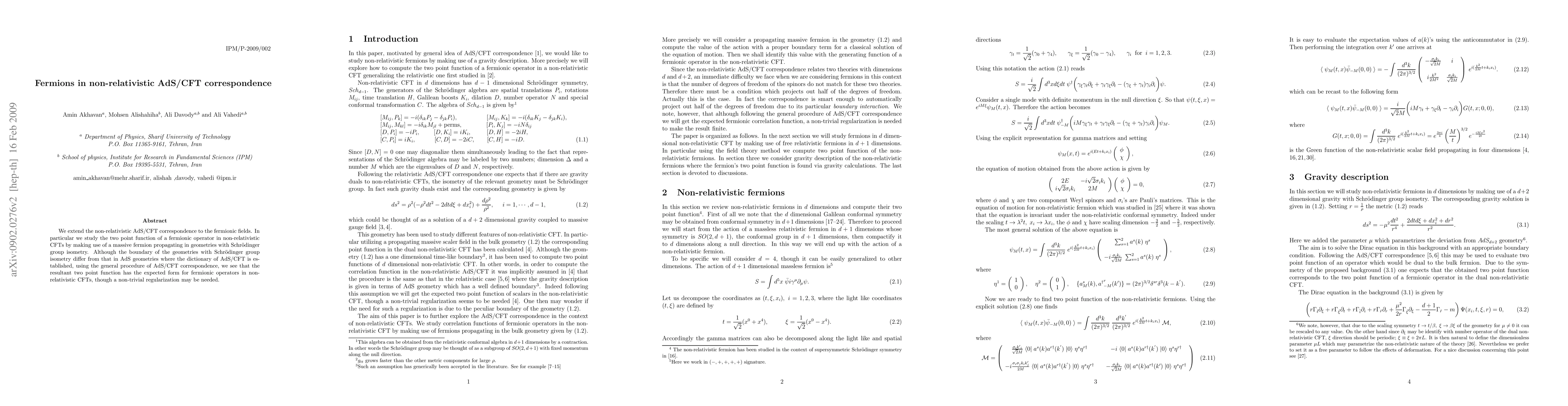 The paper presents a detailed analysis of fermionic fields in the non-relativistic AdS/CFT correspondence, deriving the two-point function for fermionic operators in non-relativistic CFTs using geometries with Schrödinger group isometry.
