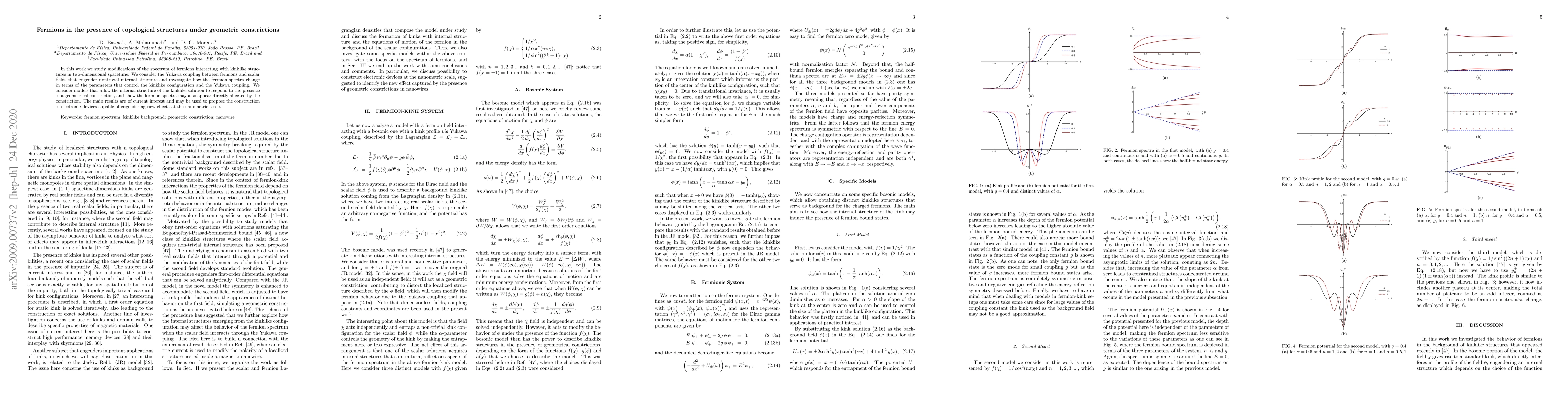 In this work we study modifications of the spectrum of fermions interacting with kinklike structures in two-dimensional spacetime. We consider the Yukawa coupling between fermions and scalar fields that engender nontrivial internal structure and investigate how the fermion spectra change in terms of the parameters that control the kinklike configuration and the Yukawa coupling. We consider models that allow the internal structure of the kinklike solution to respond to the presence of a geometrical constriction, and show the fermion spectra may also appear directly affected by the constriction. The main results are of current interest and may be used to propose the construction of electronic devices capable of engendering new effects at the nanometric scale.