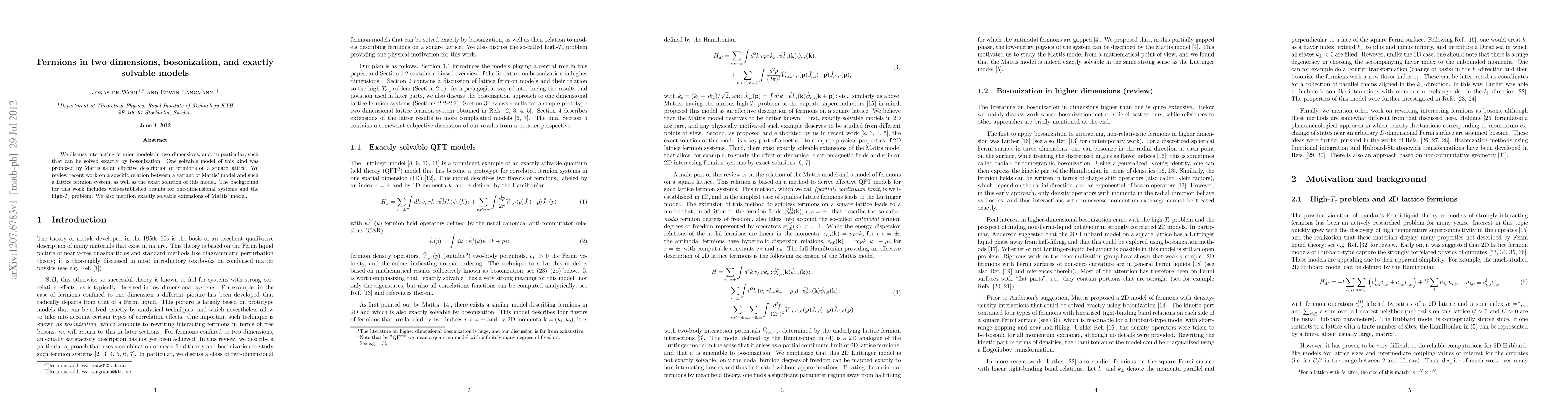 We discuss interacting fermion models in two dimensions, and, in particular, such that can be solved exactly by bosonization. One solvable model of this kind was proposed by Mattis as an effective description of fermions on a square lattice. We review recent work on a specific relation between a variant of Mattis' model and such a lattice fermion system, as well as the exact solution of this model. The background for this work includes well-established results for one-dimensional systems and the high-Tc problem. We also mention exactly solvable extensions of Mattis' model.
