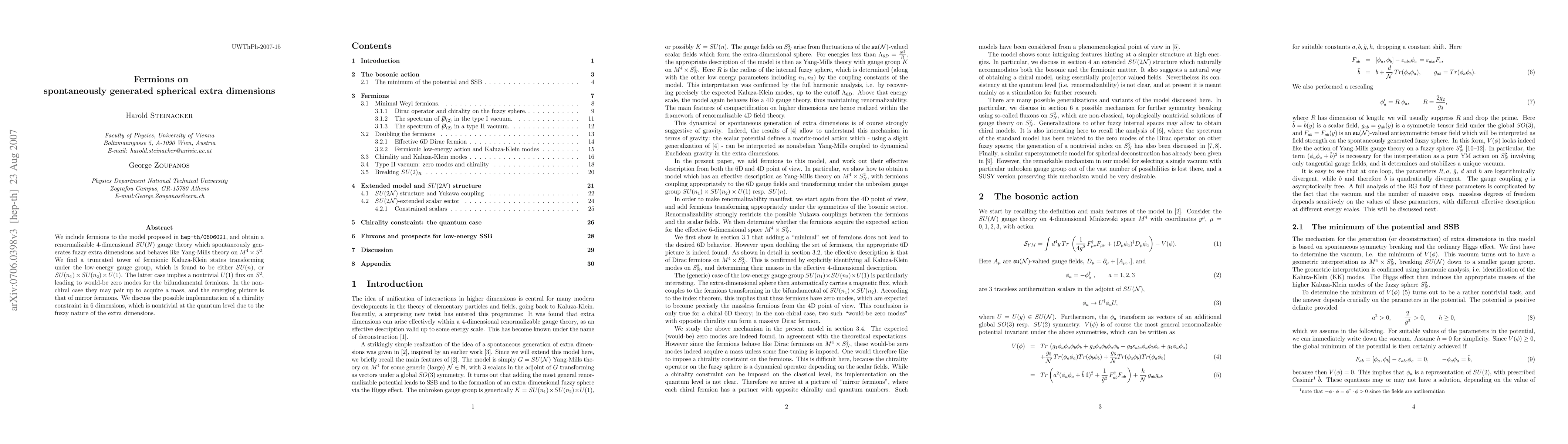 This paper extends a model with spontaneously generated spherical extra dimensions to include fermions, resulting in a renormalizable 4D SU(N) gauge theory. It finds fermionic Kaluza-Klein states that suggest the emergence of mirror fermions and discusses the implications of a chirality constraint in a 6D setting.