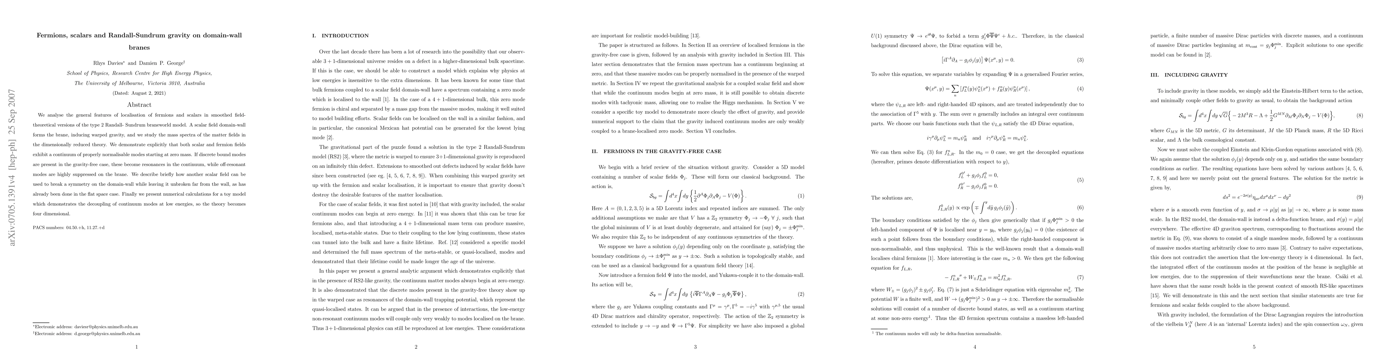 The paper analyzes fermions and scalars in smoothed versions of the Randall-Sundrum braneworld model, focusing on a scalar field domain-wall brane and warped gravity, demonstrating localization of matter fields through mass spectra in the dimensionally reduced theory.