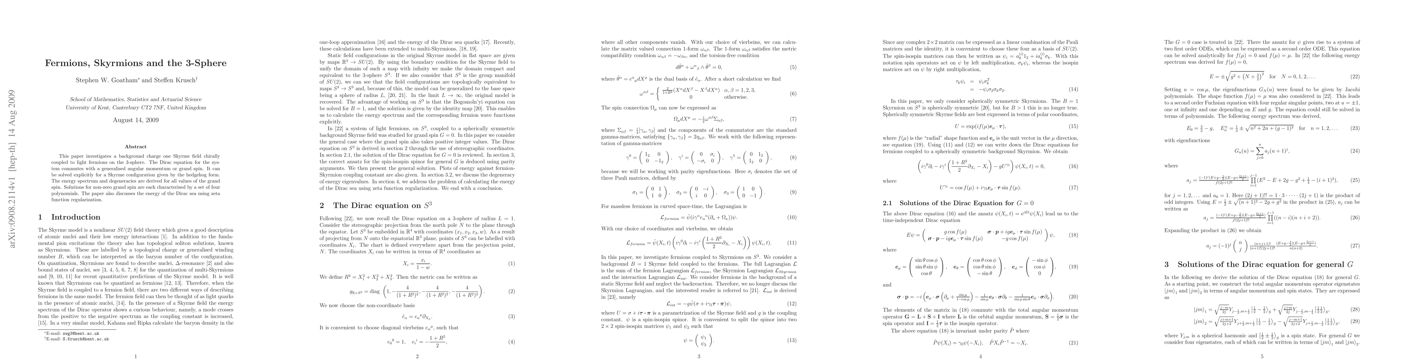 This paper investigates a background charge one Skyrme field chirally coupled to light fermions on the 3-sphere. The Dirac equation for the system commutes with a generalised angular momentum or grand spin. It can be solved explicitly for a Skyrme configuration given by the hedgehog form. The energy spectrum and degeneracies are derived for all values of the grand spin. Solutions for non-zero grand spin are each characterised by a set of four polynomials. The paper also discusses the energy of the Dirac sea using zeta function regularization.
