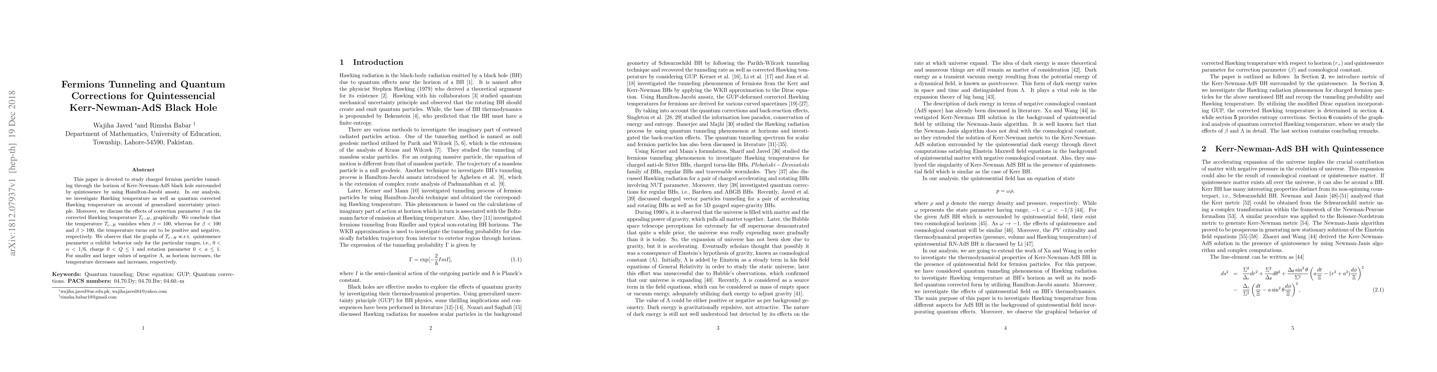 This paper examines charged fermion particles tunneling through a Kerr-Newman-AdS black hole with quintessence, using the Hamilton-Jacobi method. It investigates Hawking temperature and quantum corrections based on the generalized uncertainty principle, finding that the corrected Hawking temperature $T_{e-H}$ vanishes at $\beta=100$ and exhibits positive and negative values for $\beta<100$ and $\beta>100$, respectively.