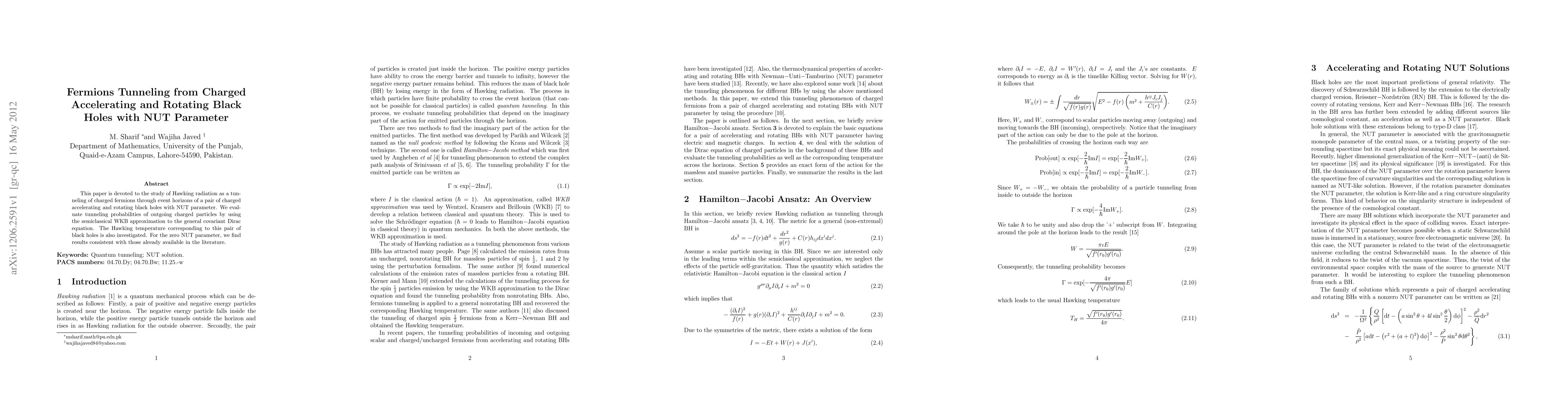 This paper is devoted to the study of Hawking radiation as a tunneling of charged fermions through event horizons of a pair of charged accelerating and rotating black holes with NUT parameter. We evaluate tunneling probabilities of outgoing charged particles by using the semiclassical WKB approximation to the general covariant Dirac equation. The Hawking temperature corresponding to this pair of black holes is also investigated. For the zero NUT parameter, we find results consistent with those already available in the literature.