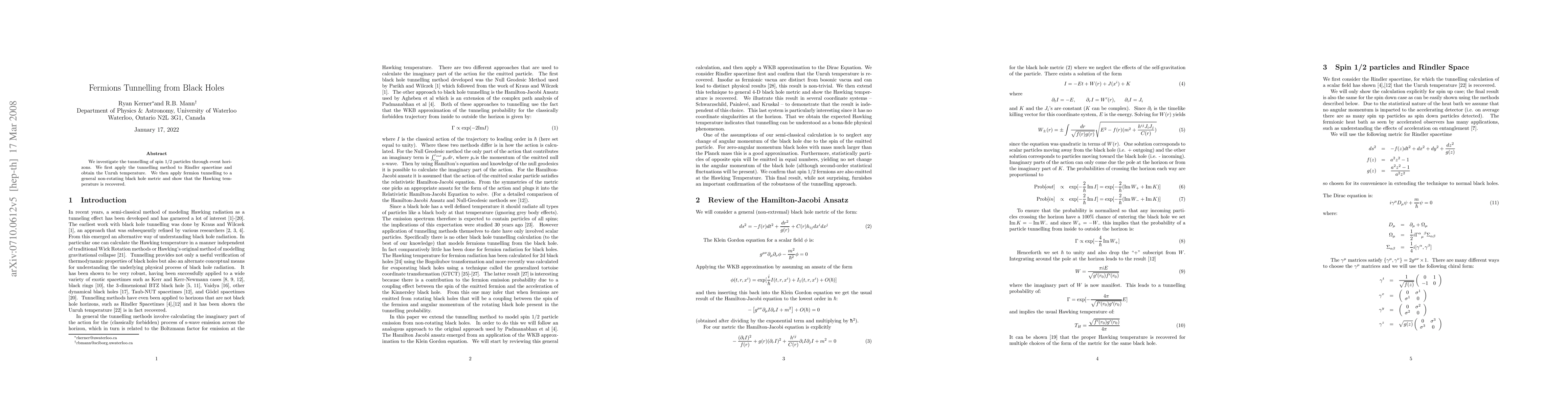 This paper explores the tunnelling of spin 1/2 particles through black hole event horizons, first demonstrating the Unruh effect in Rindler spacetime, and then showing that fermion tunnelling in a general non-rotating black hole metric reproduces the Hawking temperature.