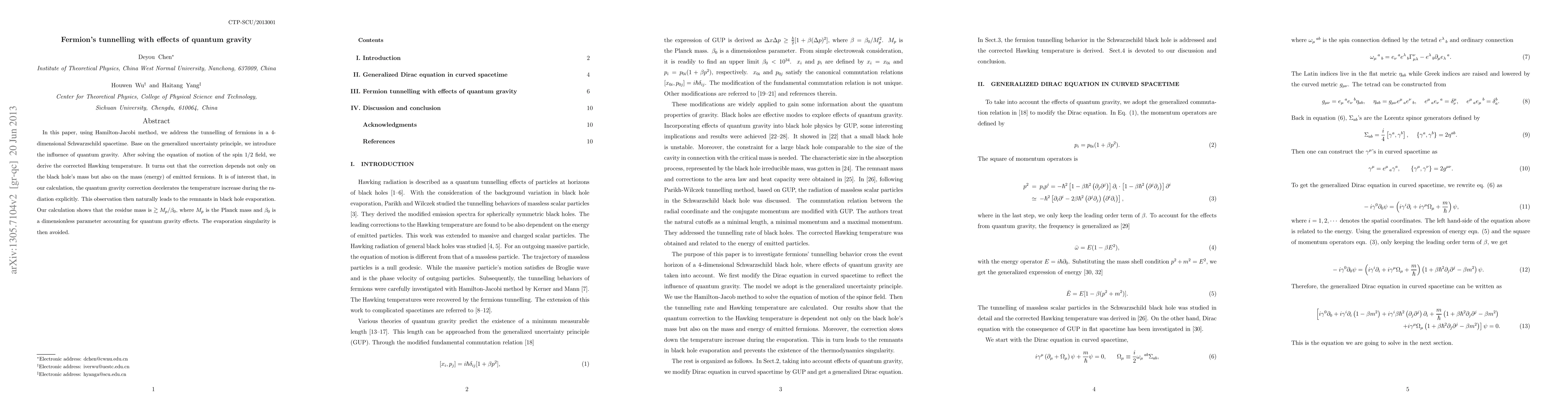 This paper investigates the tunnelling of fermions in a Schwarzschild black hole using the Hamilton-Jacobi method, incorporating quantum gravity via the generalized uncertainty principle. The study finds that quantum gravity corrections modify the Hawking temperature, slowing its increase and leading to black hole remnants, thus avoiding the evaporation singularity.
