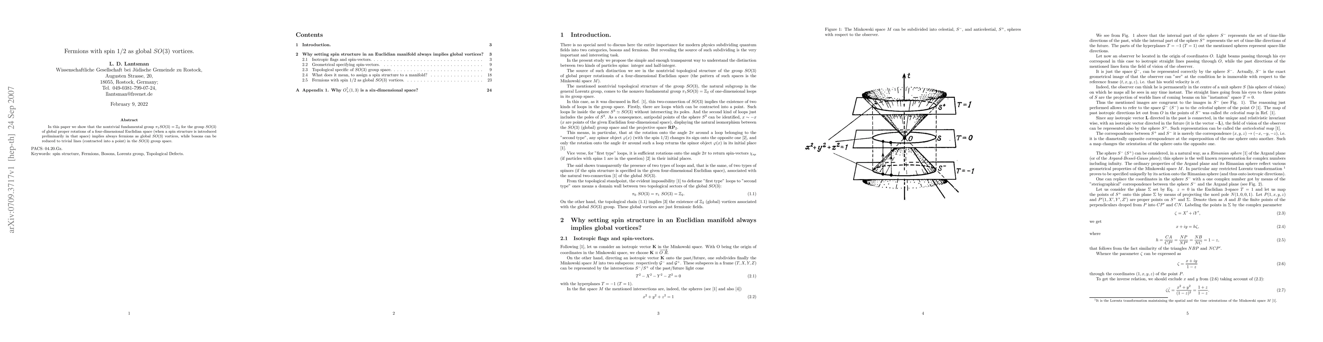 In this paper we show that the nontrivial fundamental group $\pi_1 SO(3) ={\Bbb Z}_2$ for the group SO(3) of global proper rotations of a four-dimensional Euclidian space (when a spin structure is introduced preliminarily in that space) implies always fermions as global SO(3) vortices, while bosons can be reduced to trivial lines (contracted into a point) in the SO(3) group space.