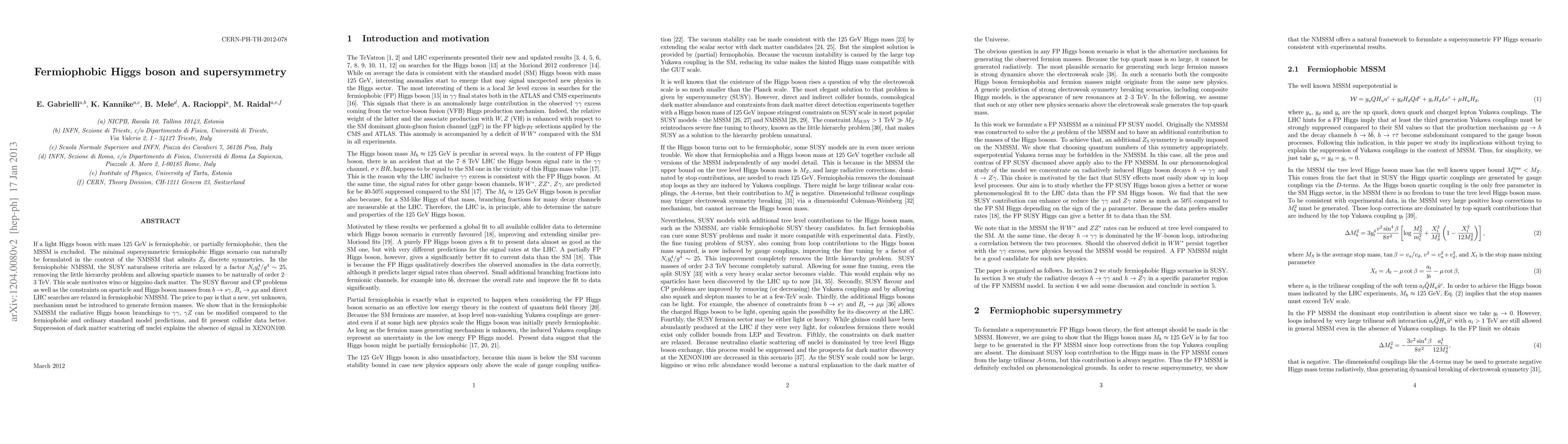 If a light Higgs boson with mass 125 GeV is fermiophobic, or partially fermiophobic, then the MSSM is excluded. The minimal supersymmetric fermiophobic Higgs scenario can naturally be formulated in the context of the NMSSM that admits Z_3 discrete symmetries. In the fermiophobic NMSSM, the SUSY naturalness criteria are relaxed by a factor N_c y_t^4/g^4 \sim 25, removing the little hierarchy problem and allowing sparticle masses to be naturally of order 2--3 TeV. This scale motivates wino or higgsino dark matter. The SUSY flavour and CP problems as well as the constraints on sparticle and Higgs boson masses from b \to s\gamma, B_s \to \mu\mu\ and direct LHC searches are relaxed in fermiophobic NMSSM. The price to pay is that a new, yet unknown, mechanism must be introduced to generate fermion masses. We show that in the fermiophobic NMSSM the radiative Higgs boson branchings to \gamma\gamma, \gamma Z can be modified compared to the fermiophobic and ordinary standard model predictions, and fit present collider data better. Suppression of dark matter scattering off nuclei explains the absence of signal in XENON100.