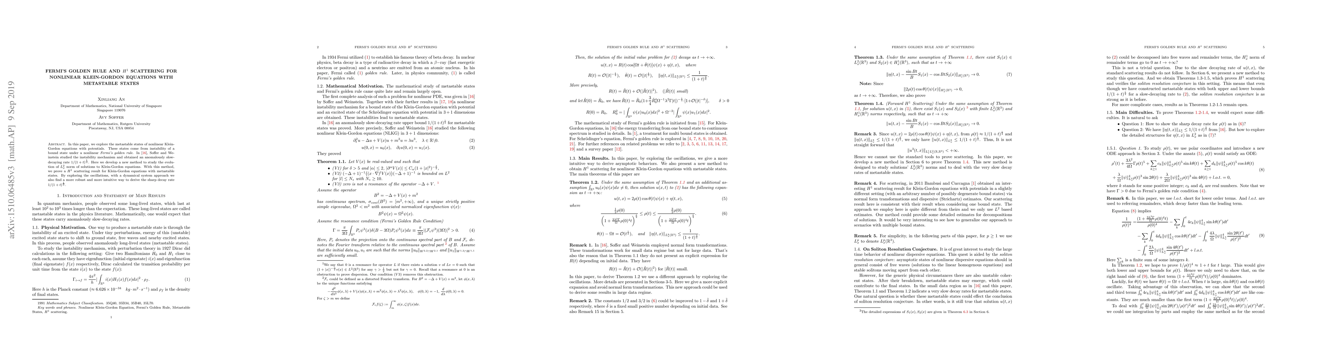 In this paper, we explore the metastable states of nonlinear Klein-Gordon equations with potentials. These states come from the instability of a bound state under a nonlinear Fermi's golden rule. In [16], Soffer and Weinstein studied the instability mechanism and obtained an anomalously slow-decaying rate $1/(1+t)^{\frac{1}{4}}$. Here we develop a new method to study the $L^2_x$ norm of solutions to Klein-Gordon equations. With this method, we prove the first $H^1$ scattering result for Klein-Gordon equations with metastable states. By exploring the oscillations, we also give another more robust and more intuitive approach to derive the sharp decay rate $1/(1+t)^{\frac{1}{4}}$.