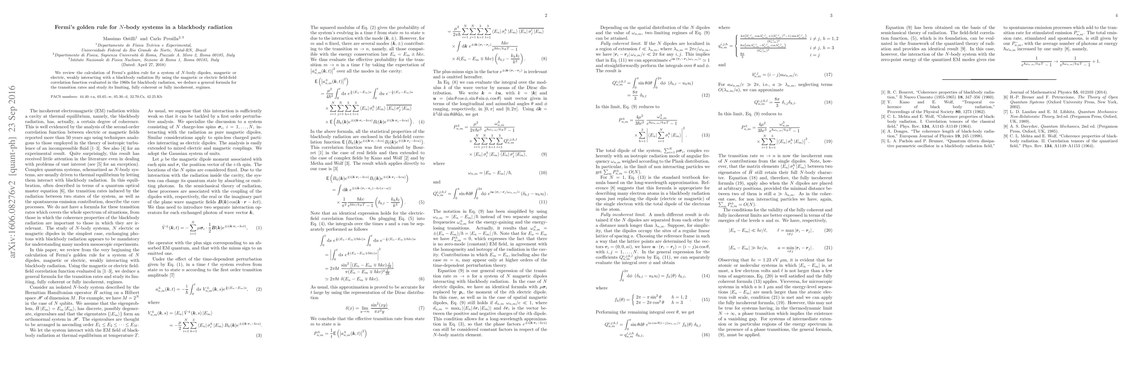 The paper reviews the calculation of Fermi's golden rule for an N-body system of dipoles interacting with black-body radiation, using the magnetic or electric field-field correlation function evaluated in the 1960s.