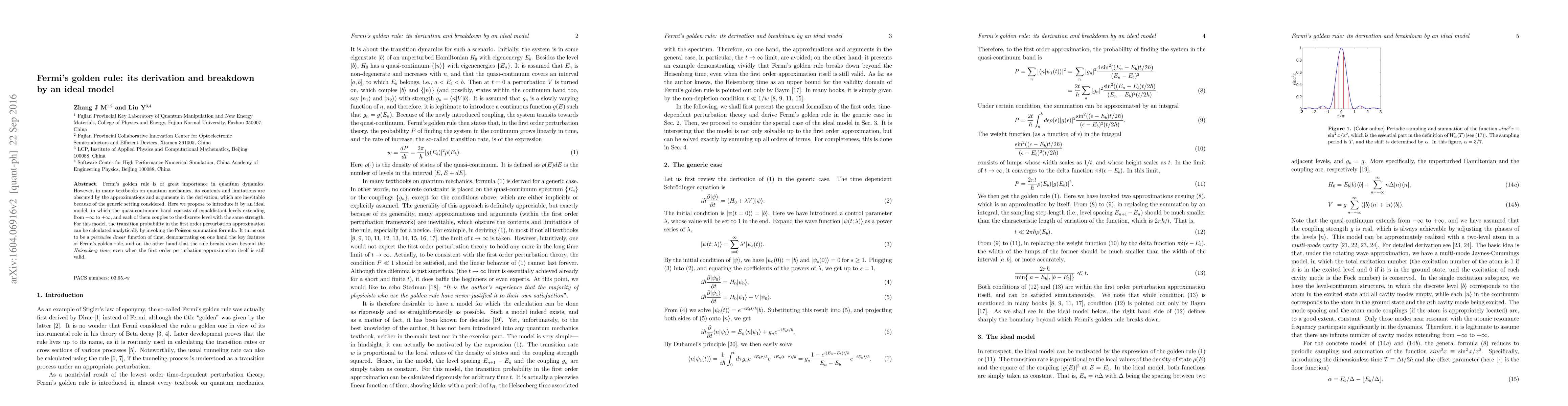 This paper derives Fermi's golden rule using an ideal model with equally spaced energy levels, revealing its key features and demonstrating its breakdown beyond the Heisenberg time through analytical calculations. The transition probability is shown to be a piecewise linear function of time, highlighting both the rule's validity and its limitations.