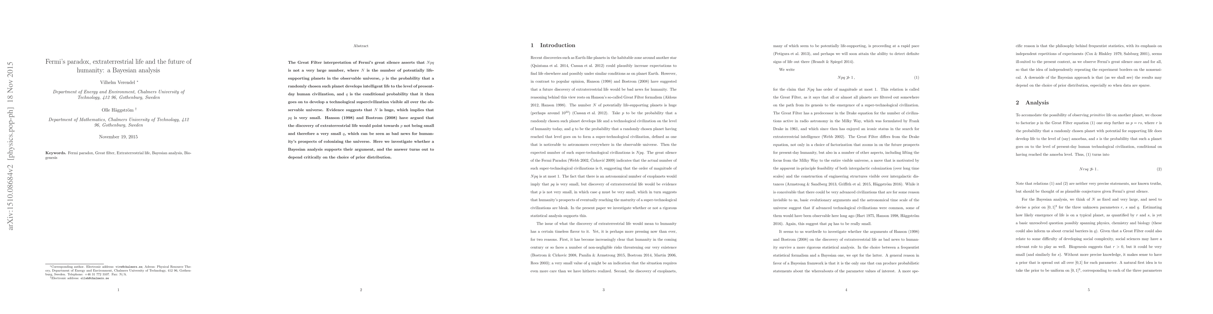 This research examines the Great Filter hypothesis of Fermi's paradox using Bayesian analysis, finding that the conclusion about humanity's future depends heavily on the selected prior distribution, thus challenging the notion that discovering extraterrestrial life is necessarily bad news for human colonization prospects.