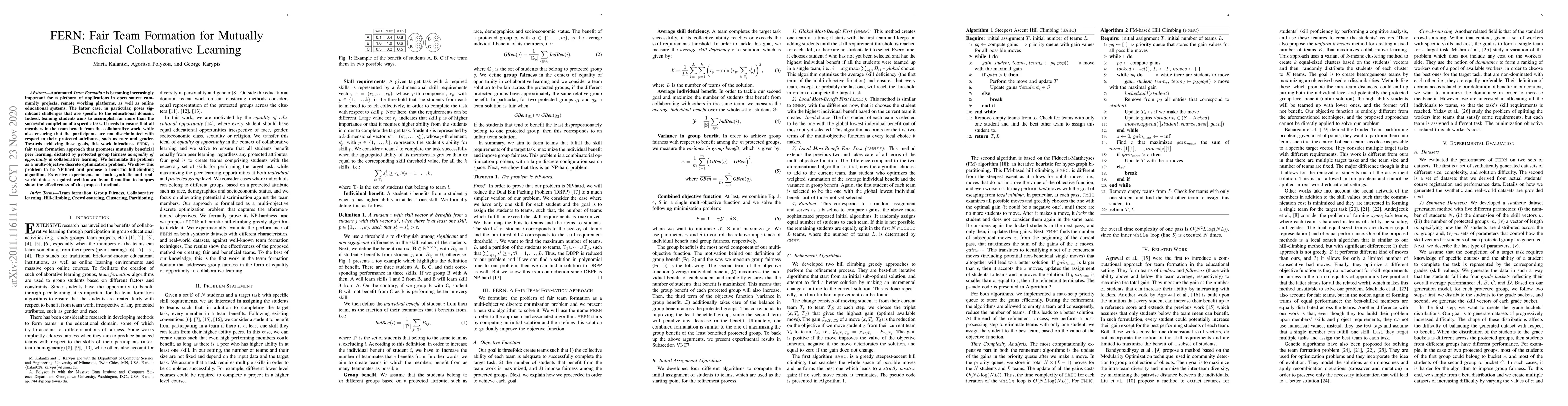 This paper introduces FERN, a fair team formation method for educational collaborative learning that aims to ensure mutual benefit and equality of opportunity among students, while avoiding discrimination based on protected attributes. The authors propose a heuristic algorithm to solve the NP-hard optimization problem and demonstrate its effectiveness through experiments on both synthetic and real datasets.