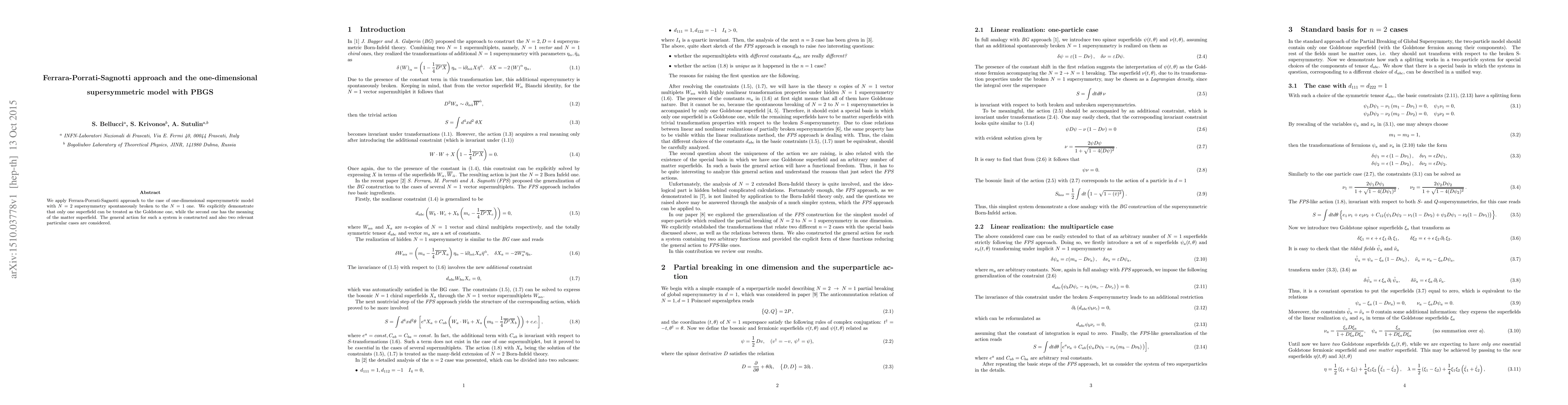 We apply Ferrara-Porrati-Sagnotti approach to the case of one-dimensional supersymmetric model with N=2 supersymmetry spontaneously broken to the N=1 one. We explicitly demonstrate that only one superfield can be treated as the Goldstone one, while the second one has the meaning of the matter superfield. The general action for such a system is constructed and also two relevant particular cases are considered.