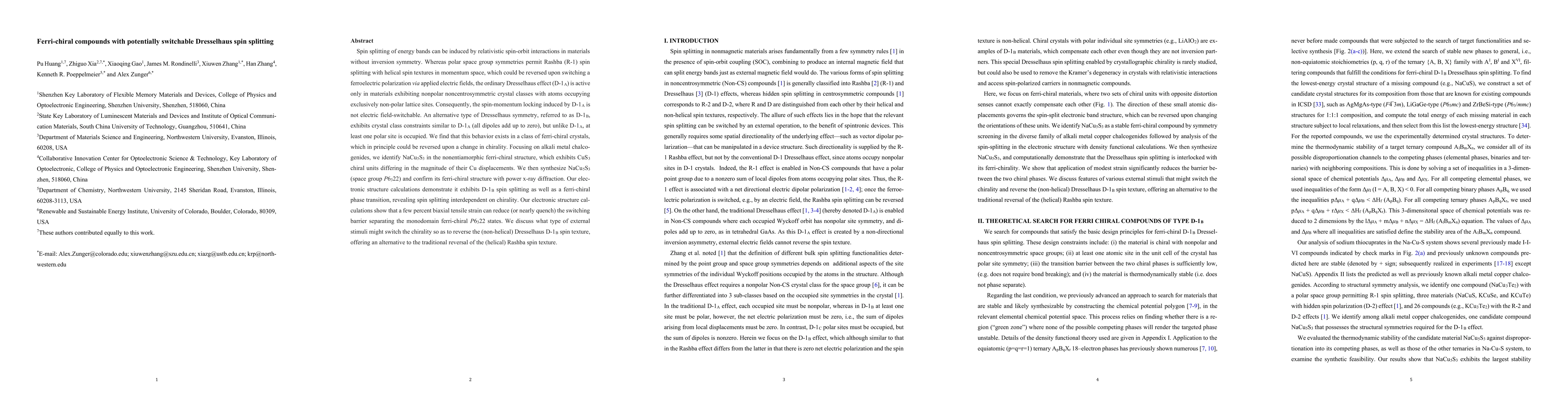 Spin splitting of energy bands can be induced by relativistic spin-orbit interactions in materials without inversion symmetry. Whereas polar space group symmetries permit Rashba (R-1) spin splitting with helical spin textures in momentum space, which could be reversed upon switching a ferroelectric polarization via applied electric fields, the ordinary Dresselhaus effect (D-1A) is ac-tive only in materials exhibiting nonpolar noncentrosymmetric crystal classes with atoms occupy-ing exclusively non-polar lattice sites. Consequently, the spin-momentum locking induced by D-1A is not electric field-switchable. An alternative type of Dresselhaus symmetry, referred to as D-1B, exhibits crystal class constraints similar to D-1A (all dipoles add up to zero), but unlike D-1A, at least one polar site is occupied. We find that this behavior exists in a class of ferri-chiral crys-tals, which in principle could be reversed upon a change in chirality. Focusing on alkali metal chalcogenides, we identify NaCu5S3 in the nonentiamorphic ferri-chiral structure, which exhibits CuS3 chiral units differing in the magnitude of their Cu displacements. We then synthesize NaCu5S3 (space group P6322) and confirm its ferri-chiral structure with power x-ray diffraction. Our electronic structure calculations demonstrate it exhibits D-1B spin splitting as well as a ferri-chiral phase transition, revealing spin splitting interdependent on chirality. Our electronic struc-ture calculations show that a few percent biaxial tensile strain can reduce (or nearly quench) the switching barrier separating the monodomain ferri-chiral P6322 states. We discuss what type of external stimuli might switch the chirality so as to reverse the (non-helical) Dresselhaus D-1B spin texture, offering an alternative to the traditional reversal of the (helical) Rashba spin texture.