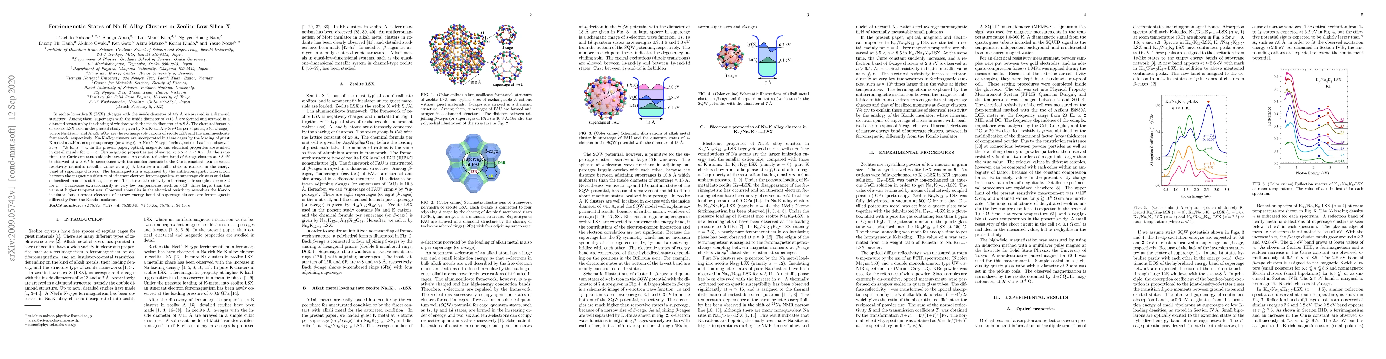 In zeolite low-silica X (LSX), beta-cages with the inside diameter of approx 7 AA{} are arrayed in a diamond structure. Among them, supercages with the inside diameter of approx 13 AA{} are formed and arrayed in a diamond structure by the sharing of windows with the inside diameter of approx 8 AA{}. The chemical formula of zeolite LSX used in the present study is given by Na$_{x}$K$_{12-x}$Al$_{12}$Si$_{12}$O$_{48}$ per supercage (or beta-cage), where Na$_{x}$K$_{12-x}$ and Al$_{12}$Si$_{12}$O$_{48}$ are the exchangeable cations of zeolite LSX and the aluminosilicate framework, respectively. Na-K alloy clusters are incorporated in these cages by the loading of guest K metal at $n$K atoms per supercage (or beta-cage). A N'eel's N-type ferrimagnetism has been observed at $n = 7.8$ for $x = 4$. In the present paper, optical, magnetic and electrical properties are studied in detail mainly for $x = 4$. Ferrimagnetic properties are observed at $6.5 < n < 8.5$. At the same time, the Curie constant suddenly increases. An optical reflection band of beta-cage clusters at 2.8 eV is observed at $n > 6.5$ in accordance with the sudden increase in the Curie constant. An electrical resistivity indicates metallic values at $n$ gtrapprox 6, because a metallic state is realized in the energy band of supercage clusters. The ferrimagnetism is explained by the antiferromagnetic interaction between the magnetic sublattice of itinerant electron ferromagnetism at supercage clusters and that of localized moments at beta-cage clusters. The electrical resistivity in ferrimagnetic samples at $n = 8.2$ for $x = 4$ increases extraordinarily at very low temperatures, such as approx $10^6$ times larger than the value at higher temperatures. Observed anomalies in the electrical resistivity resembles the Kondo insulator, but itinerant electrons of narrow energy band of supercage clusters are ferromagnetic.