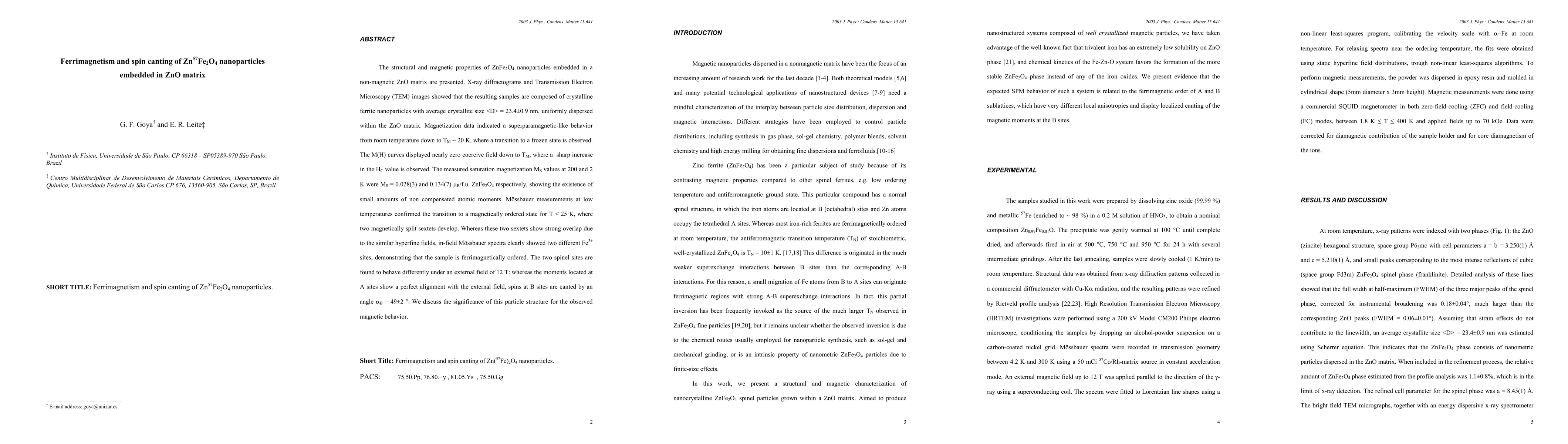 This study investigates ZnFe2O4 nanoparticles embedded in a ZnO matrix, revealing their crystalline structure and ferrimagnetic properties via X-ray diffraction and TEM. The samples exhibit superparamagnetic behavior transitioning to a magnetically ordered ferrimagnetic state below 20 K, with distinct spin canting observed in Fe3+ sites under an external field.