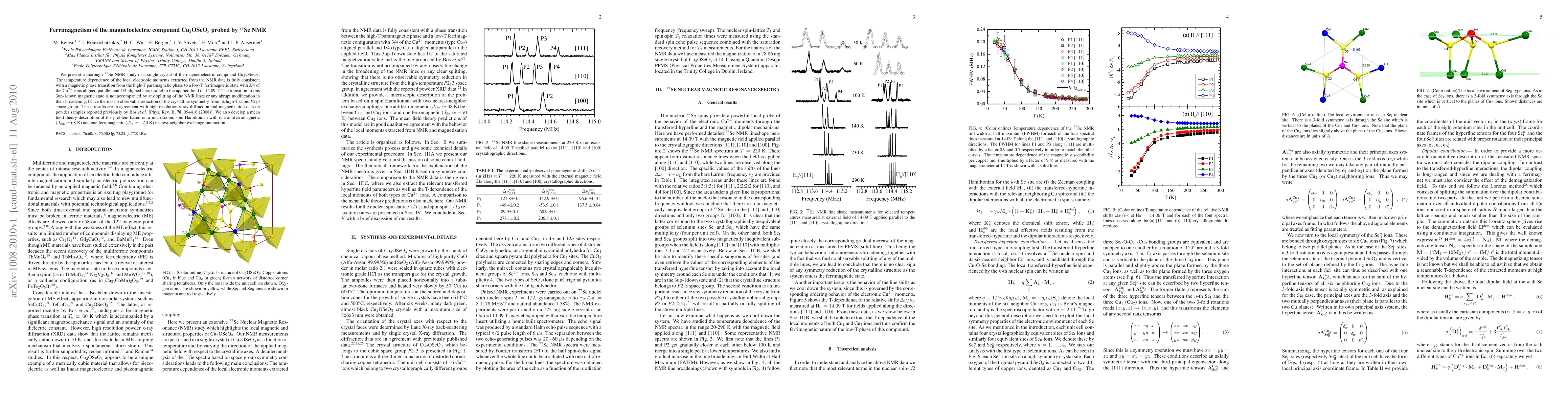 Researchers used $^{77}$Se NMR to study Cu$_2$OSeO$_3$, a magnetoelectric compound, finding it undergoes a magnetic phase transition at low temperatures from paramagnetic to ferrimagnetic states with 75% of Cu$^{2+}$ ions aligned.