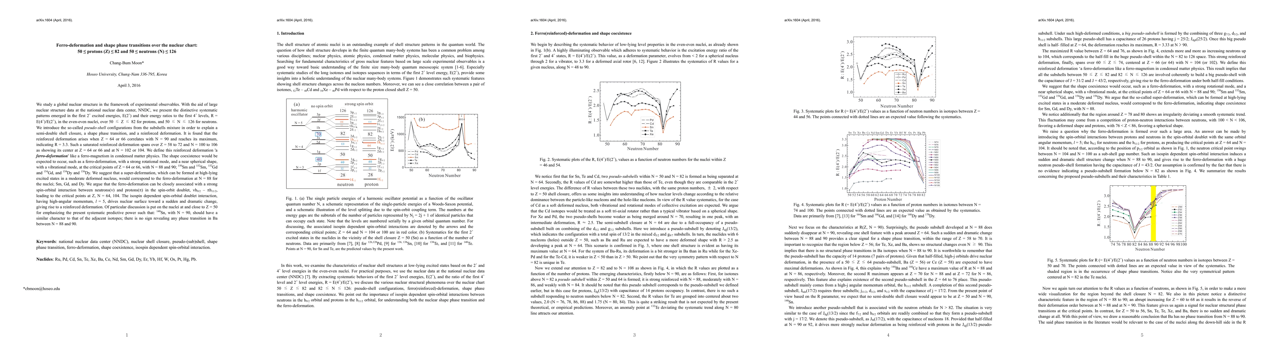 We study a global nuclear structure in the framework of experimental observables. With the aid of large nuclear structure data at the national nuclear data center, NNDC, we present the distinctive systematic patterns emerged in the first 2+ excited energies, E(2+) and their energy ratios to the first 4+ levels, R = E(4+)/E(2+), in the even-even nuclei, over 50 < Z < 82 for protons, and 50 < N < 126 for neutrons. We introduce the so-called pseudo-shell configurations from the subshells mixture in order to explain a semi-double shell closure, a shape phase transition, and a reinforced deformation. It is found that the reinforced deformation arises when Z = 64 or 66 correlates with N = 90 and reaches its maximum, indicating R = 3.3. Such a saturated reinforced deformation spans over Z = 58 to 72 and N = 100 to 106 as showing its center at Z = 64 or 66 and at N = 102 or 104. We define this reinforced deformation 'a ferro-deformation' like a ferro-magnetism in condensed matter physics. The shape coexistence would be expected to occur, such as a ferro-deformation, with a strong rotational mode, and a near spherical shape, with a vibrational mode, at the critical points of Z = 64 or 66, with N = 88 and 90; 150Sm and 152Sm, 152Gd and 154Gd, and 154Dy and 156Dy. We suggest that a super-deformation, which can be formed at high-lying excited states in a moderate deformed nucleus, would correspond to the ferro-deformation at N = 88 for the nuclei; Sm, Gd, and Dy. We argue that the ferro-deformation can be closely associated with a strong spin-orbital interaction between neutrons and protons in the spin-orbit doublet, h9/2-h11/2, leading to the critical points at Z, N = 64, 104.