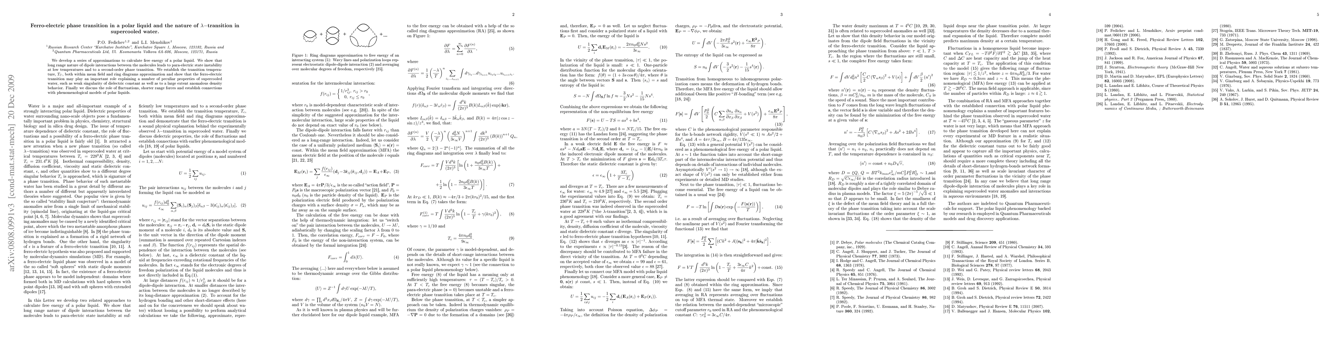 This paper develops approximations to calculate the free energy of a polar liquid, demonstrating that dipole interactions lead to a second-order phase transition into a ferro-electric state at low temperatures. The study suggests this transition may explain anomalies in supercooled water's dielectric constant and density behavior.
