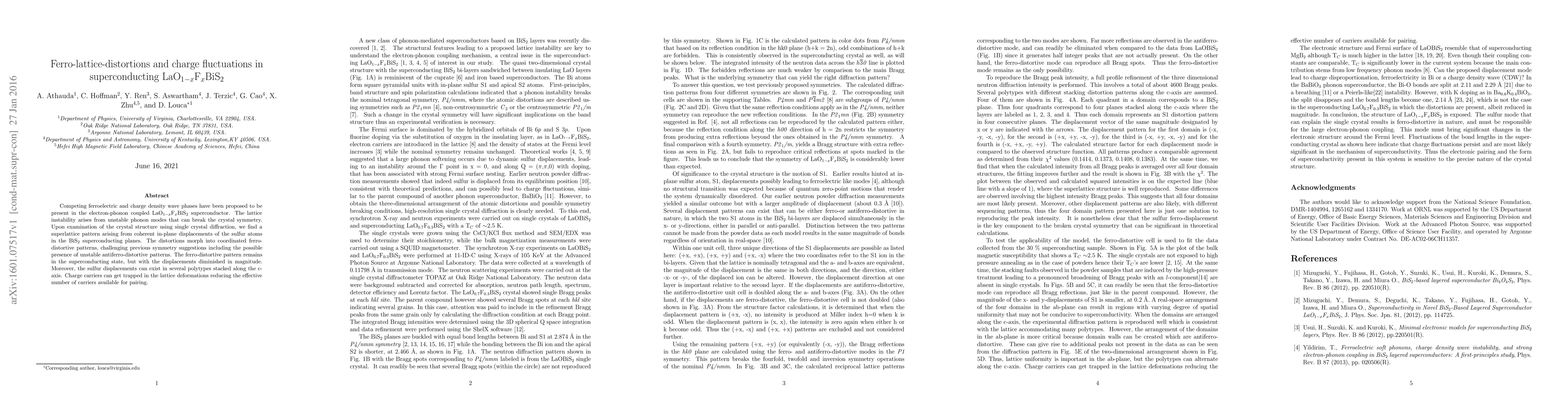 Competing ferroelectric and charge density wave phases have been proposed to be present in the electron-phonon coupled LaO$_{1-x}$F$_{x}$BiS$_{2}$ superconductor. The lattice instability arises from unstable phonon modes that can break the crystal symmetry. Upon examination of the crystal structure using single crystal diffraction, we find a superlattice pattern arising from coherent in-plane displacements of the sulfur atoms in the BiS$_{2}$ superconducting planes. The distortions morph into coordinated ferro-distortive patterns, challenging previous symmetry suggestions including the possible presence of unstable antiferro-distortive patterns. The ferro-distortive pattern remains in the superconducting state, but with the displacements diminished in magnitude. Moreover, the sulfur displacements can exist in several polytypes stacked along the c-axis. Charge carriers can get trapped in the lattice deformations reducing the effective number of carriers available for pairing.