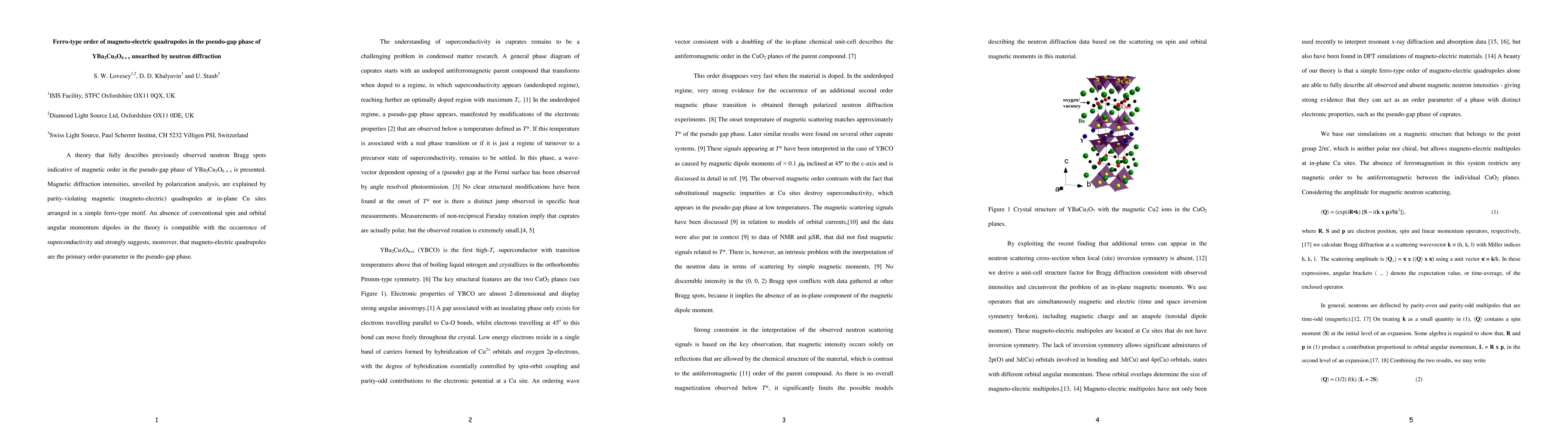 A theory that fully describes previously observed neutron Bragg spots indicative of magnetic order in the pseudo-gap phase of YBa2Cu3O6 + x is presented. Magnetic diffraction intensities, unveiled by polarization analysis, are explained by parity-violating magnetic (magneto-electric) quadrupoles at in-plane Cu sites arranged in a simple ferro-type motif. An absence of conventional spin and orbital angular momentum dipoles in the theory is compatible with the occurrence of superconductivity and strongly suggests, moreover, that magneto-electric quadrupoles are the primary order-parameter in the pseudo-gap phase.