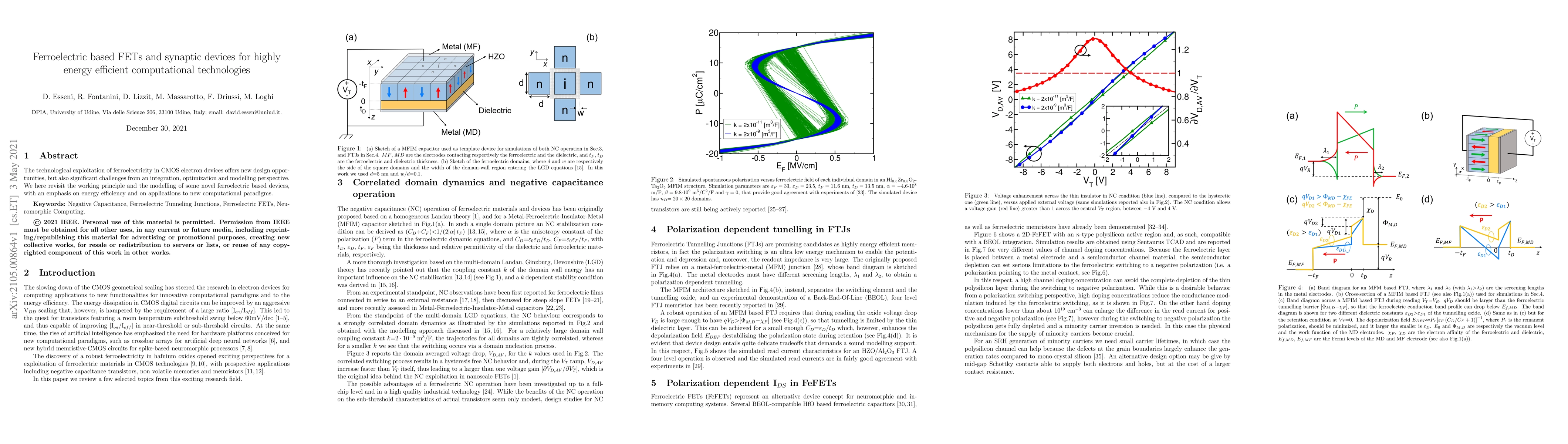 The technological exploitation of ferroelectricity in CMOS electron devices offers new design opportunities, but also significant challenges from an integration, optimization and modelling perspective. We here revisit the working principle and the modelling of some novel ferroelectric based devices, with an emphasis on energy efficiency and on applications to new computational paradigms.