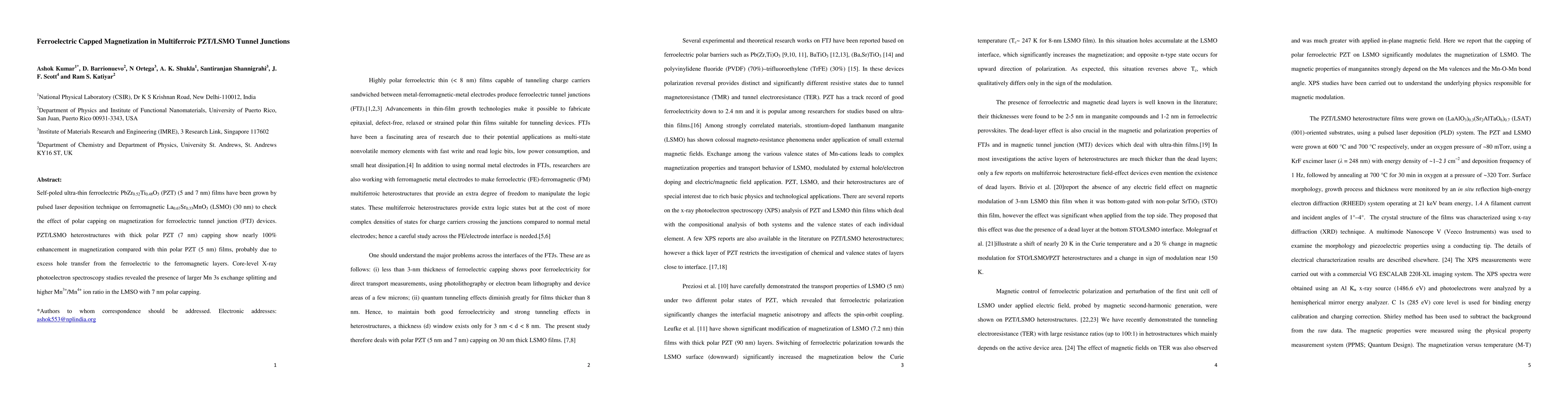 This study explores the impact of ultra-thin ferroelectric PZT capping on the magnetization of LSMO in multiferroic PZT/LSMO tunnel junctions. Thicker PZT capping (7 nm) significantly enhances magnetization, likely due to increased hole transfer, as evidenced by enhanced Mn 3s exchange splitting and higher Mn3+/Mn4+ ratio.